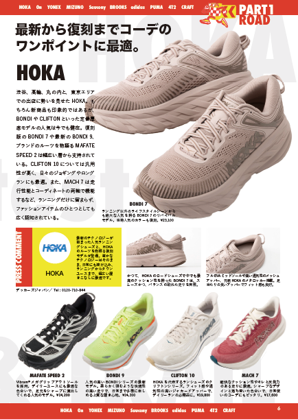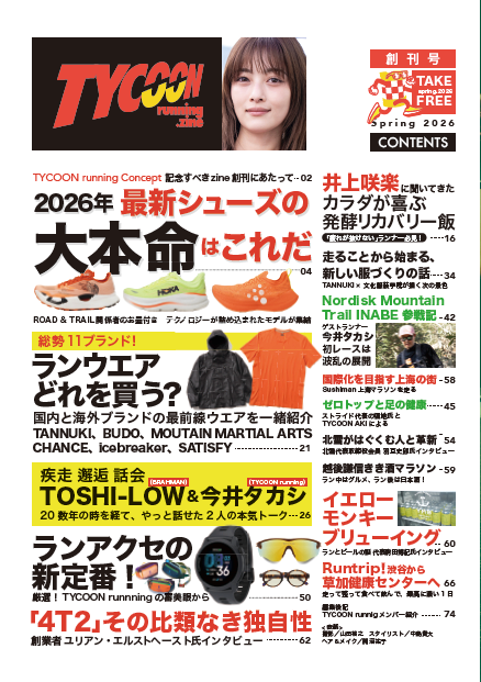 創刊号の表紙は、井上桜楽さんが登場。各メーカー担当者によるリコメンド付きの最新シューズ情報から、TYCOONがおすすめするランニングアクセなどの特集記事も。