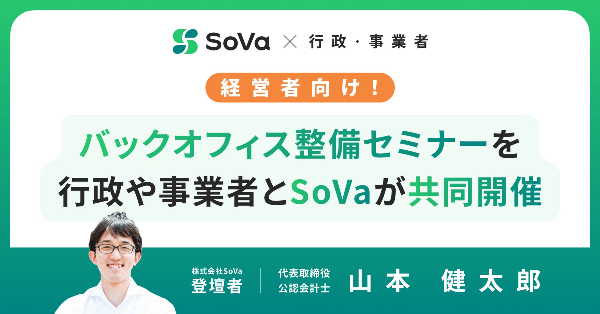 株式会社SoVa(本社:東京都中央区、代表取締役:山本健太郎、以下「当社」)は、創業期の事業者様に向けて、創業期や資金調達に必要なバックオフィス整備をわかりやすく解説するセミナーを共同開催し、当社代表の山本健太郎が登壇いたしましたのでお知らせいたします。また今後もバックオフィスに関するセミナーを継続的に開催するべく、更にセミナー内容を充実させ、共同開催してくださる自治体や事業者、登壇機会を募集してまいります。