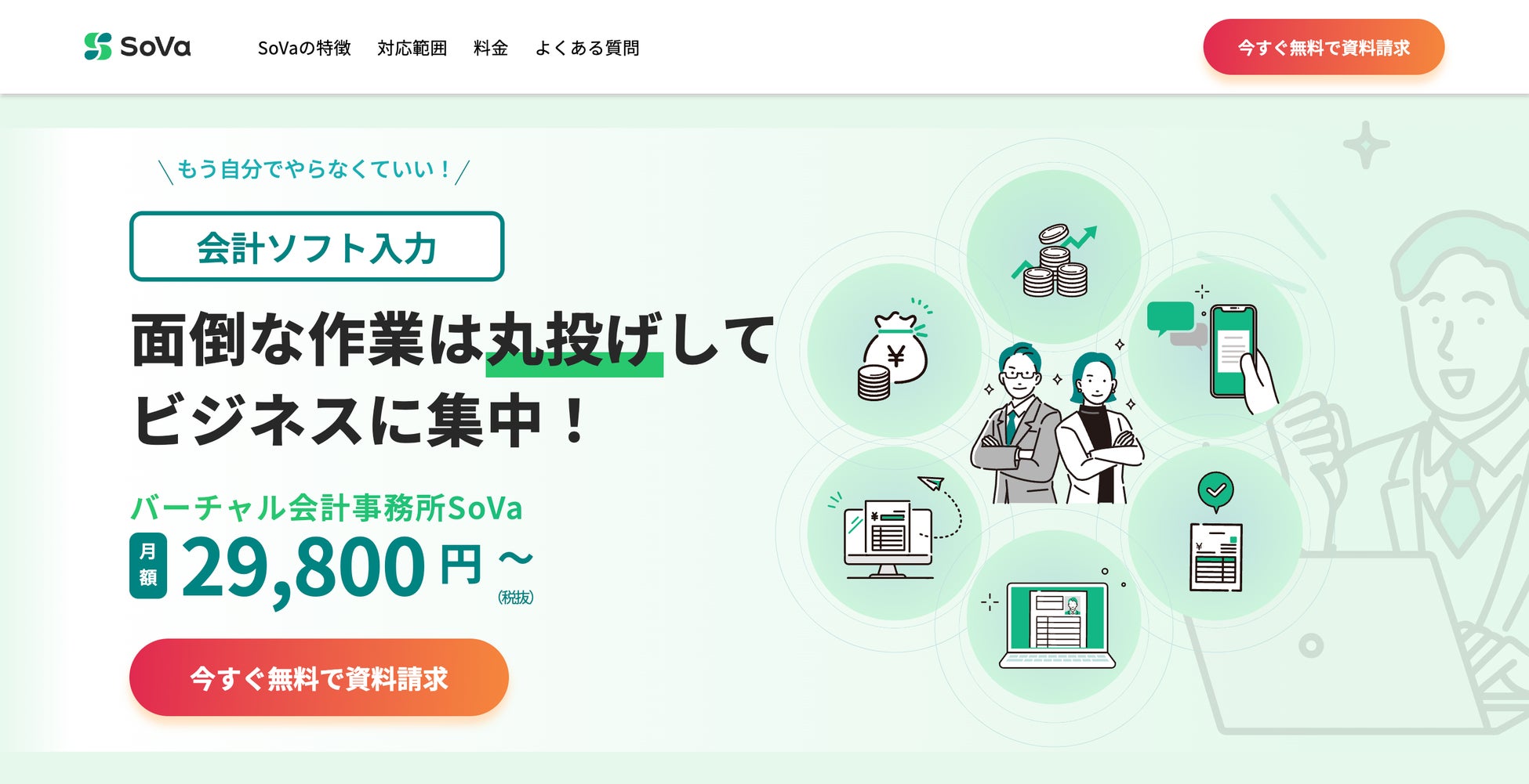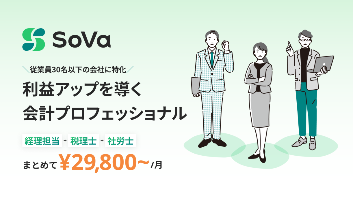 「SoVa」は、月額29,800円〜で、役所手続きの代行から記帳代行・給与計算、経営者へのアドバイスまでをワンストップで提供する、新しいかたちの会計事務所です。