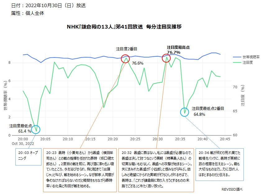 10月30日に放送された第41回「義盛、お前に罪はない」は、視聴者にどのように見られていたのでしょうか? テレビの視聴者の様子を、1分毎の「REVISIO推定視聴率」と、「テレビの前にいる人のうち、テレビ画面に視線を向けていた人の割合=注目度※」のグラフで見てみました。