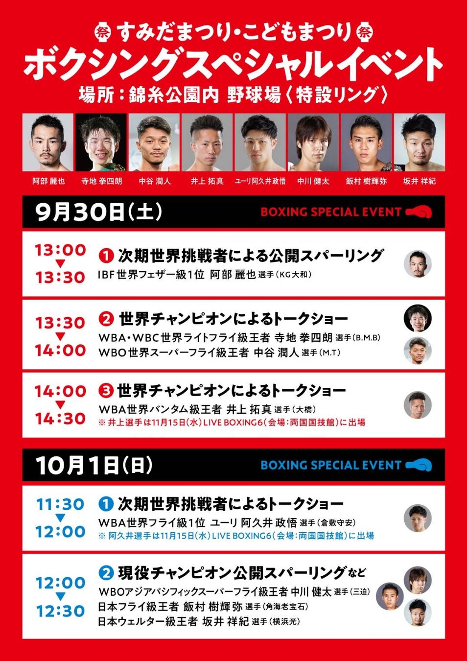 9月30日(土)・10月1日(日)墨田区主催すみだまつりにて、世界チャンピオンによるインタビュートーク、公開スパーリング、ミット打ち体験を実施!