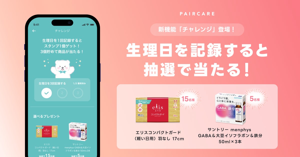 生理管理・共有サービス「ペアケア」、生理日を記録すると抽選で生理用品やセルフケアドリンクなどの景品が当たる新機能「チャレンジ」の提供を開始