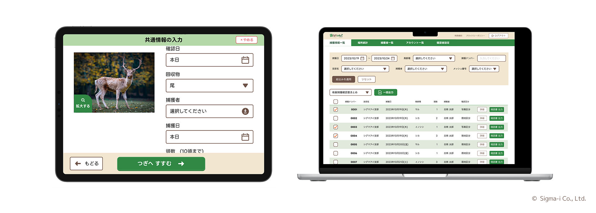 Econnectは、野生鳥獣捕獲データの効率的な収集と管理を実現するシステムを目指し、開発されました。複数の地方自治体において、従来は野生鳥獣捕獲管理を紙とExcel上のデータが存在するプロセスで行っていましたが、用紙のフォーマットは統一されていたものの、それらの用紙から野生鳥獣に関する情報を集計するために、デジタルデータとして再度入力し直す必要もあり、データ取得が非常に困難な状況でした。この問題を解決するため、Econnectは情報入力から行政文書の出力までをデジタルデータで一元化し、業務とデータ収集の効率化を可能にしました。