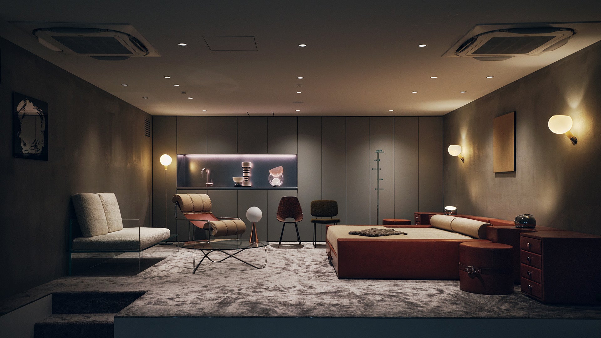 今回のショールームは元自動車整備工場だった空間をリノベーション。開放感のある天井高を活かしながらギャラリースペース、ショールームスペースと、ステップフロア構造のホテルライクなラグジュアリースペースとをシームレスに繋ぐ空間構成となっています。