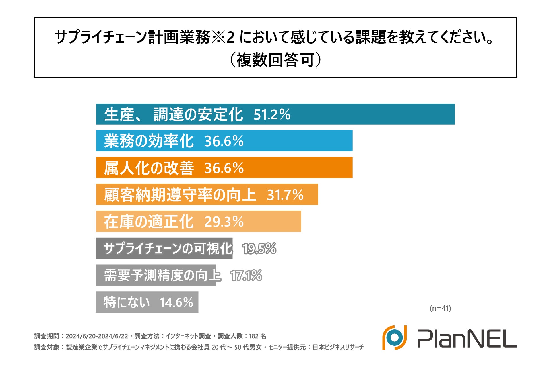 また、「サプライチェーン計画ツールを導入していない」と回答された方に「サプライチェーン計画業務において感じている課題」を尋ねる設問の回答では、1位が「生産、調達の安定化」で51.2%、2位が同率で「業務の効率化」「属人化の改善」で36.6%になりました。前項の「サプライチェーン計画ツールを導入した理由」の回答との共通点があることわかりました。