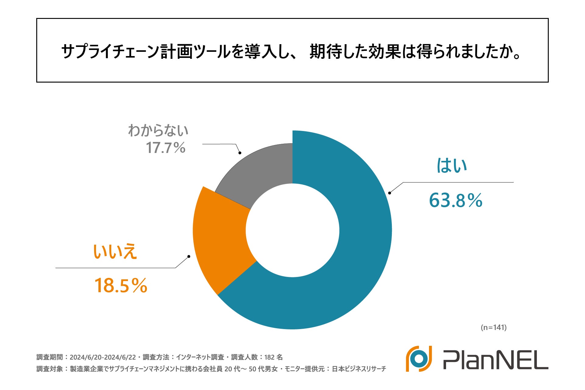 また、前項と同じ方に「サプライチェーン計画ツールを導入し、期待した効果は得られたか」を問う設問の回答では「はい」が63.8%と過半数を占め、ツールの導入により期待通りの効果を得られているという実情がわかりました。