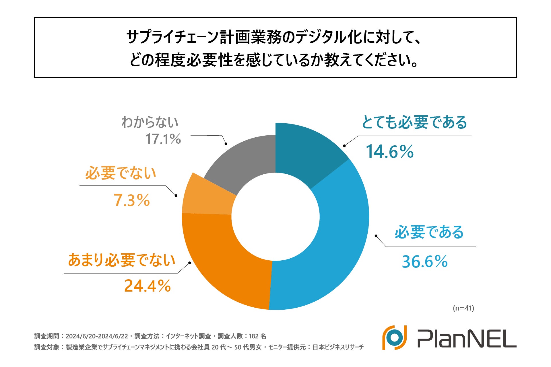 次に前項と同じ方に「サプライチェーン計画業務のデジタル化に対して、どの程度必要性を感じているか」を尋ねる設問で最も多かった回答は、「必要である」で36.6%となりました。また、「とても必要である」と回答された方も14.6%と、合計すると半数以上となり、サプライチェーン計画ツール未導入企業で働く方もその多くが「サプライチェーン計画業務のデジタル化」の必要性を感じていることが判明しました。