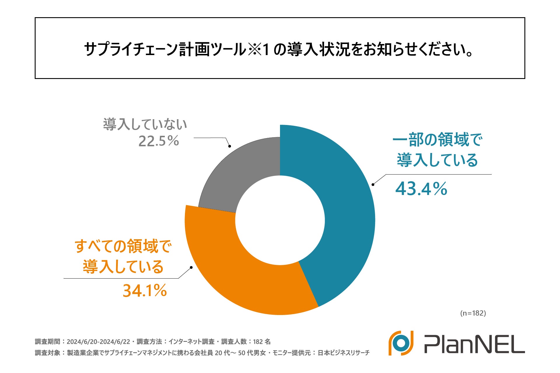 まず初めに、「サプライチェーン計画ツールの導入状況」を尋ねる設問への回答で最も多かったのは「一部の領域で導入している」で43.4%、次いで「すべての領域で導入している」で34.1%となりました。この結果から8割弱の企業が何らかサプライチェーン計画ツールを導入している事実が明らかになりました。