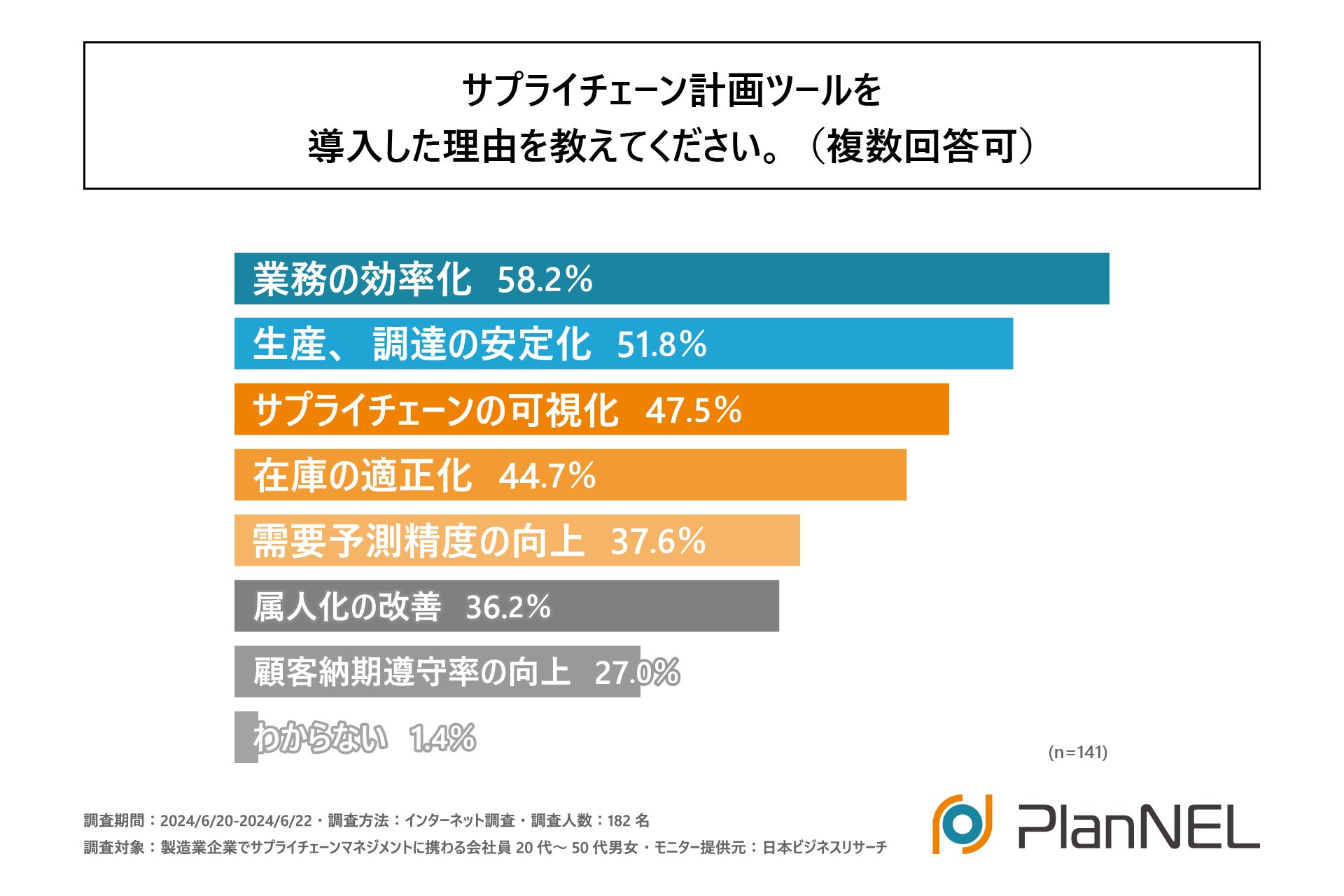 次に前項で一部、もしくはすべての領域で「導入している」と回答した方に「サプライチェーン計画ツールを導入した理由」を尋ねる設問の回答は1位「業務の効率化」で58.2%、次いで2位「生産、調達の安定化」で51.8%となりました。この結果から製造業の現場では業務効率化と生産、調達の安定化が特に重要視されているとわかりました。