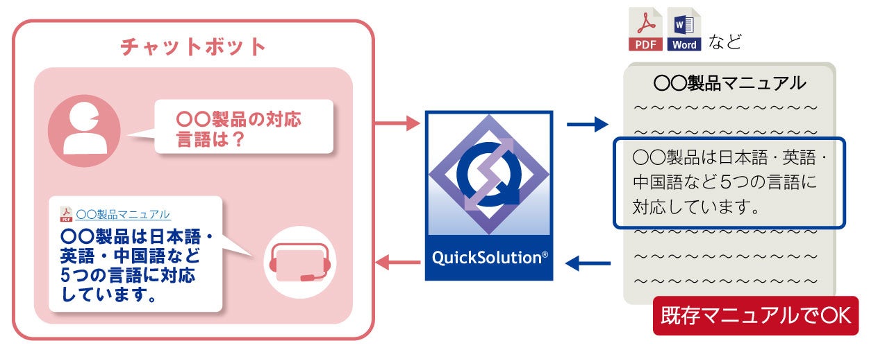 今回、提供を開始する「QuickSolution® Ver.12.3」のバージョンアップの中核となるのは、QuickSolution®のオプション機能であるAIチャットボットの強化です。チャットボットに寄せられた質問に対し、回答が記載されている可能性の高いエリアを、既存のマニュアルから抽出し回答します。回答には、抽出したテキストが記載されたマニュアルへのリンクも提示し、ワンクリックでマニュアルの該当箇所をビューワで表示されるため、関連情報の確認も簡単です。また、既存のマニュアルをそのまま活用することから、新規にFAQを作成する必要がなく、チャットボットをスムーズに導入できます。