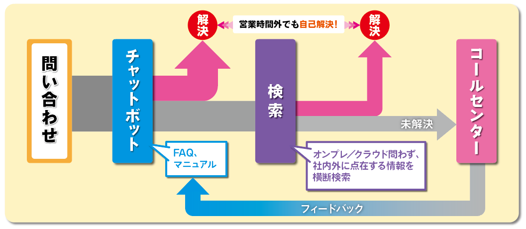 チャットボットとのやりとりで解決しない場合、一般的なチャットボットでは最終的にはコールセンターなどに問い合わせることがほとんどです。QuickSolution®では検索画面とシームレスに連携し、オンプレミスかクラウドサービスかを問わず、社内外に点在する情報を横断検索します。ユーザが「検索疲れ」せず自己解決できるため、顧客満足度の向上とコールセンターなどへの問い合わせ対応減少によるコスト削減の両立が実現できます。