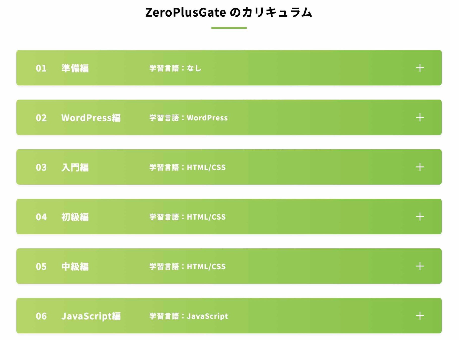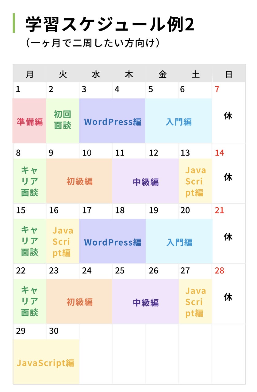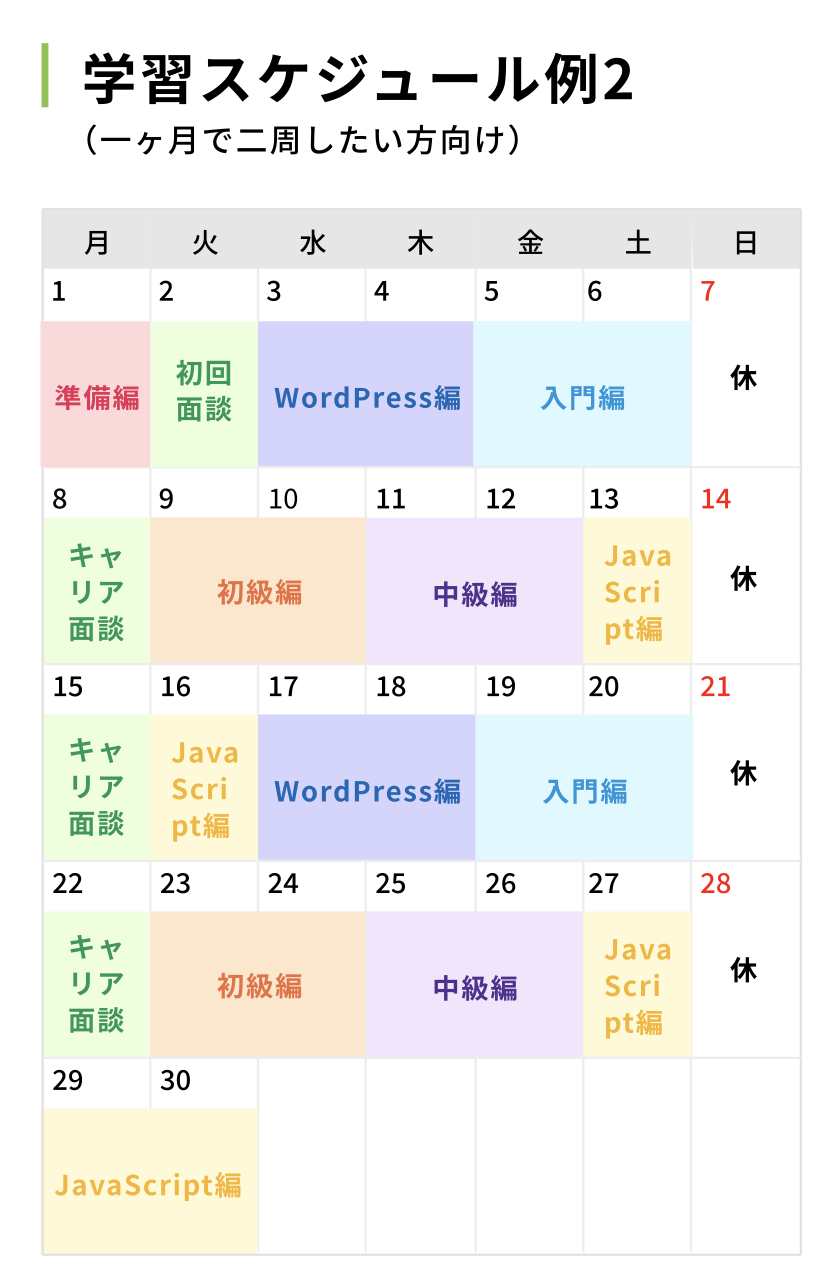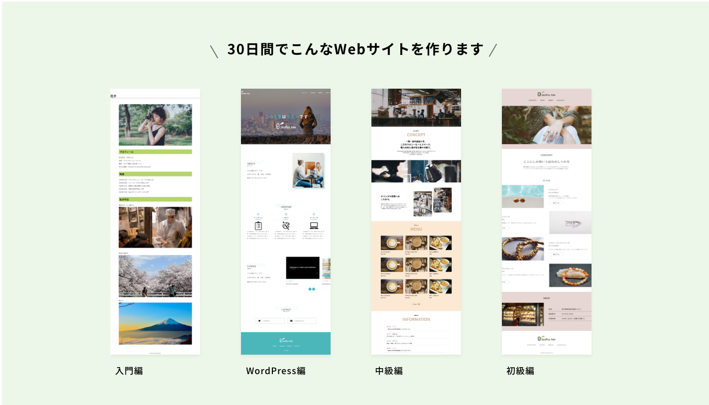 30日間のカリキュラムでは、①CMSの【WordPress】②webサイトの骨格を作る【HTML】③ページ全体を装飾する【CSS】④ページに動きをつける【JavaScript】を学ぶことができるため、受講を終える頃には基本的なwebサイトを作れるようになります。