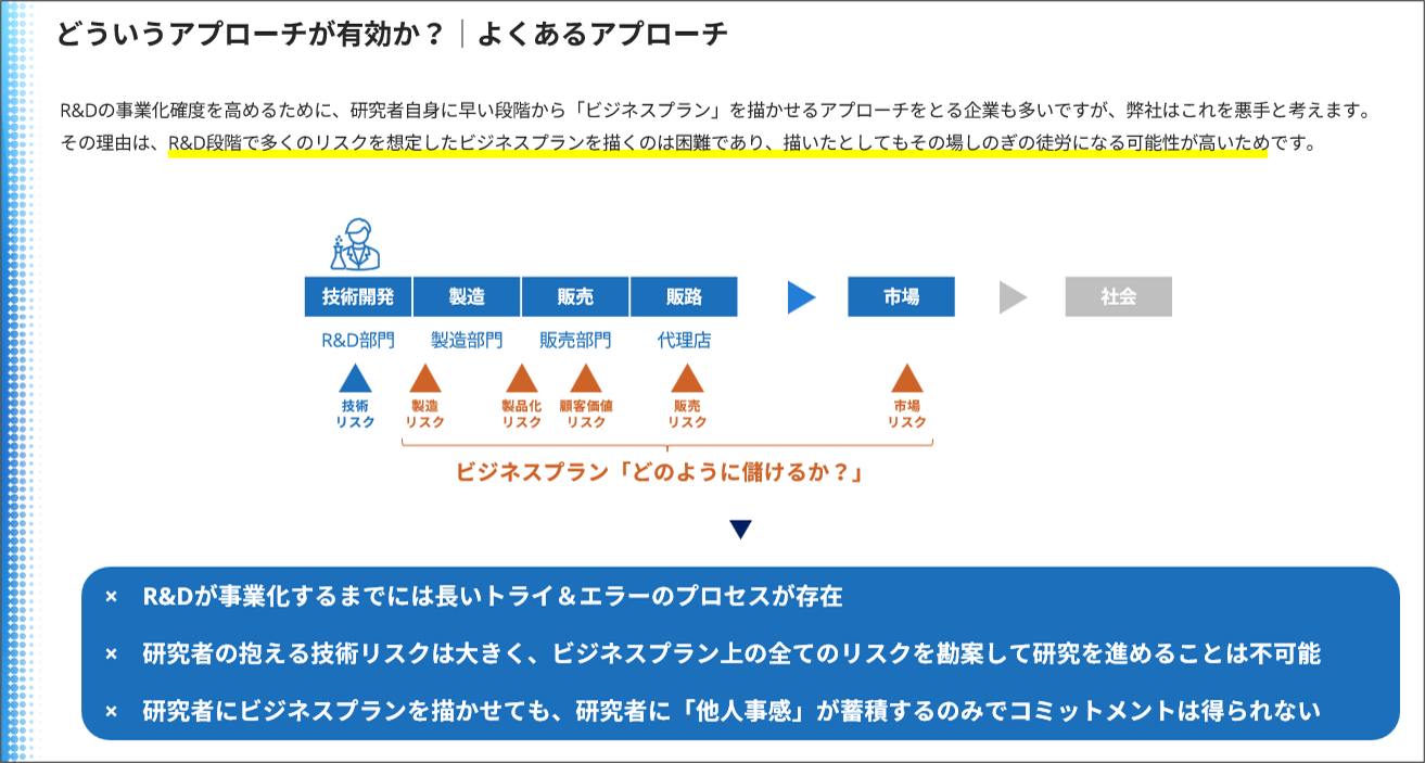 R&Dの事業化確度を高めるために、研究者自身に早い段階からビジネスプランを描かせるアプローチをとる企業は少なくありません。しかし当社は、R&D段階で多くのリスクを想定したビジネスプランを描くのは困難であり、このアプローチはむしろ現場研究者にとって「他人事感」が蓄積するだけの悪手になりかねないと考えています。