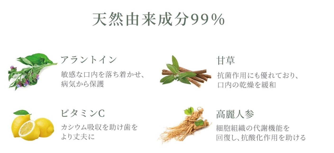 極限まで天然成分にこだわり、小さなお子様からお年寄りの方まで安心して使用できるマウスウォッシュです。特にビタミンCを配合することで、口内の細胞を酸化ストレスから保護し、口腔健康を促進します。免疫機能を向上させ、口内の細菌やウイルスに対する防御力を高め、口内感染症の予防や治療をサポートします。また、コラーゲン合成を促進し、口内組織の修復や再生をサポートするほか口臭の原因となる悪臭物質の生成を防止し、口臭の改善が期待されます。