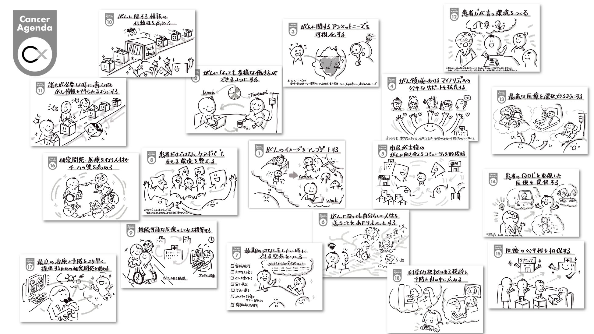 Cancer Agenda はこれまでの議論を踏まえた、がんと言われても 動揺しない社会を作るための「今、達成すべきこと(アジェンダ)」のリストです。異なる視点をもつ人々が同じアジェンダを共有することで、互いに協力しやすくなることを期待しています。