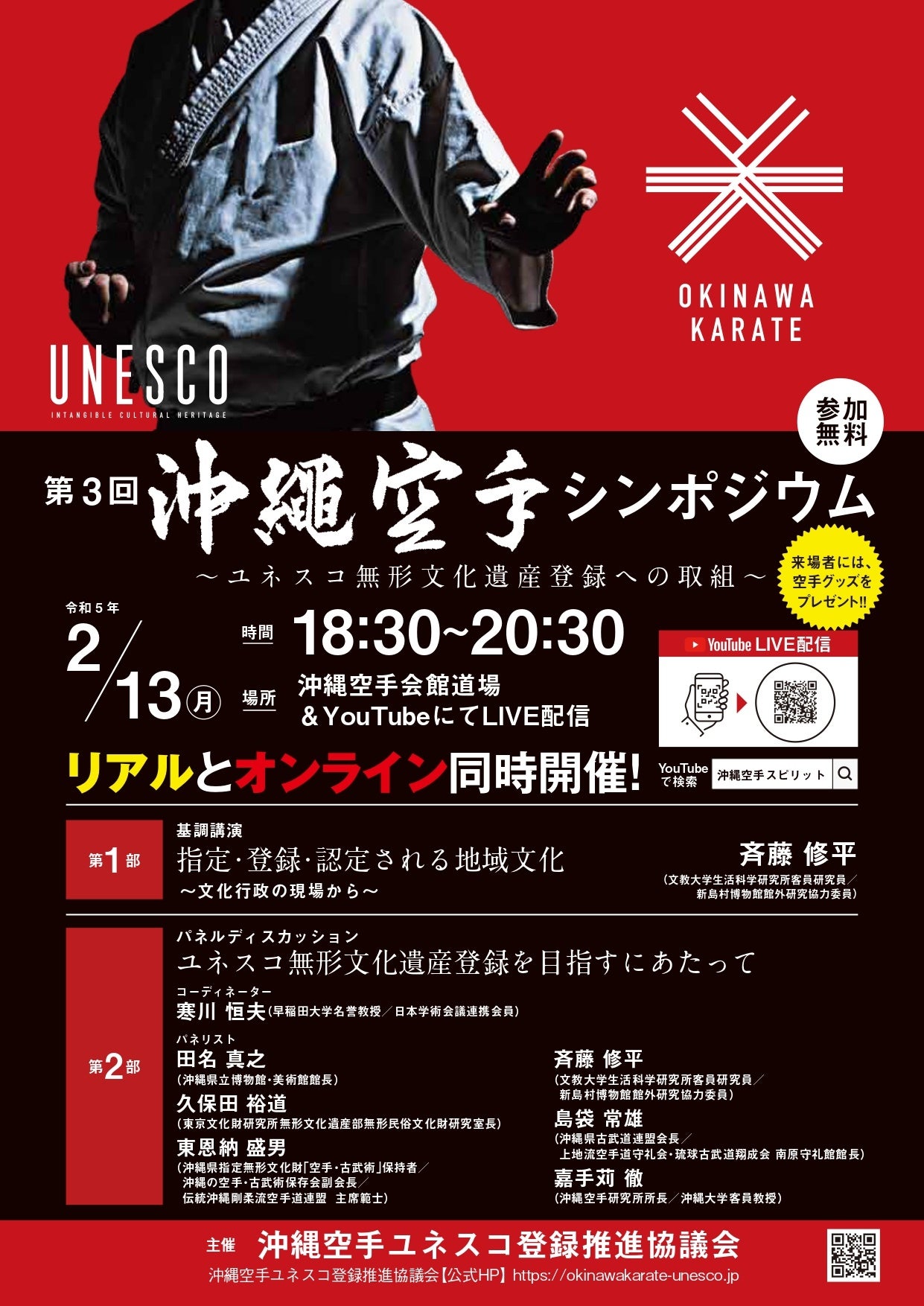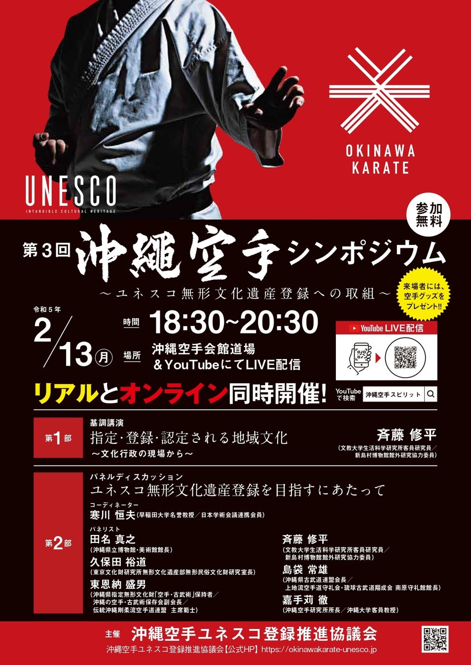 このような取組を踏まえ、シンポジウムでは、埼玉県や神奈川県における文化財の先行事例を紹介するとともに、沖縄空手の歴史や空手が地域行事に取り入れられていることも踏まえ、ユネスコ無形文化遺産登録に向けた取り組みについて講演者から助言・提言をいただく内容となっております。また、シンポジウムの模様は開催当日に沖縄県空手振興課YouTube公式アカウントでも無料配信致します。空手関係者に限らず、多くの皆様に是非ご視聴いただきたく存じます.