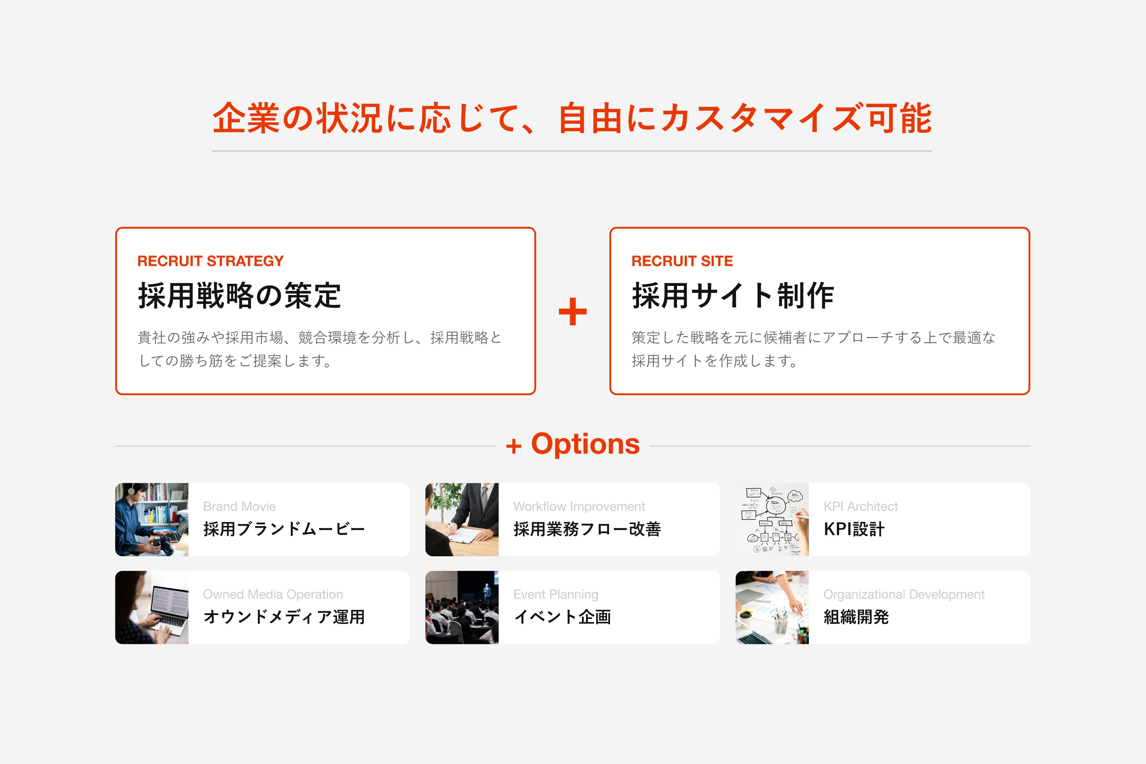 なお本サービスでは、オールインワンパッケージの他に企業が抱えている採用状況に応じて、支援メニューをカスタマイズすることも可能です。