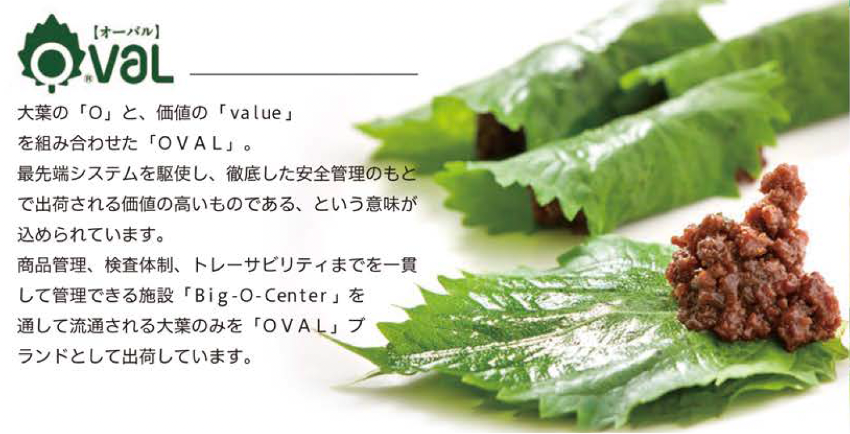 今、愛知の豊橋温室園芸農業協同組合の大葉が国産大葉として再評価されつつある。同組合のもつ大葉のブランドOVAL(オーバル)は収穫以降の工程を全て自動化し、かつコールドチェーンを維持することで高品質の大葉として供給している。通常、大葉は10枚束に輪ゴムで留める作業を外注へ委託しているが、この外部委託先が人員不足や高齢化によって供給不足となってきており、機械による自動化を導入するきっかけとなった。食料自給率の低い日本が持続可能な社会を実現する上で非常に画期的な取り組みの一つであると言える。