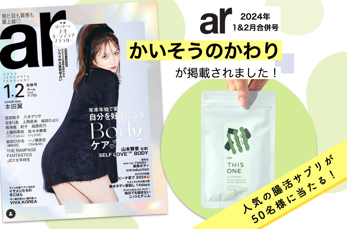 「オアディスワン」では、主婦と生活社の人気雑誌「ar(アール)」でも紹介された目的別の人気サプリメント「かいそうのかわり」を50名様にプレゼントするキャンペーンを5月1日(水)からスタートしました。「かいそうのかわり」は"腸活デトックスサプリ"としてar誌でも紹介された人気サプリメントです。
