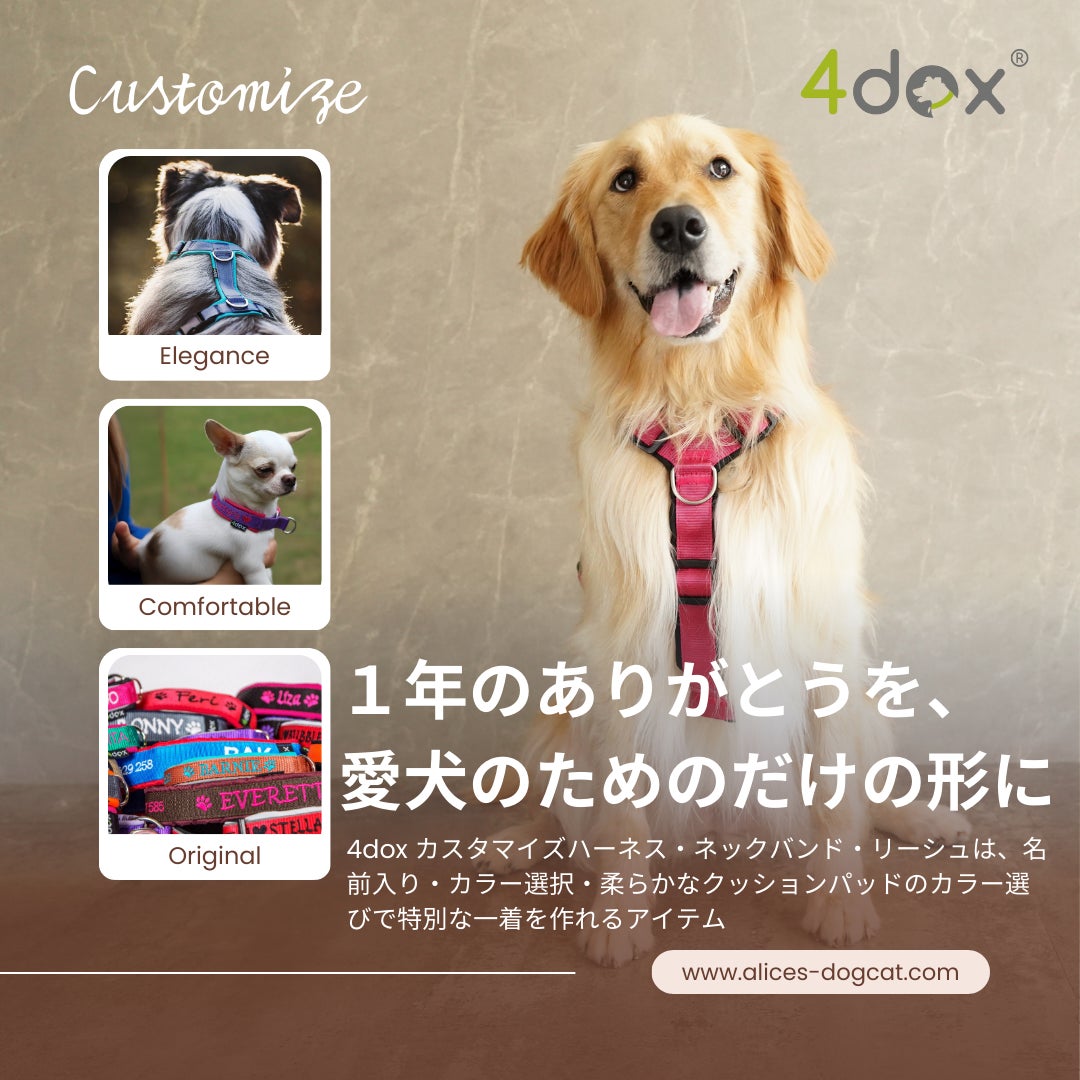 4doxのカスタムメイドハーネスは、名前入り・豊富なカラー・柔らかなクッションパッドで、愛犬に最適なオーダーメイド仕様が可能です。