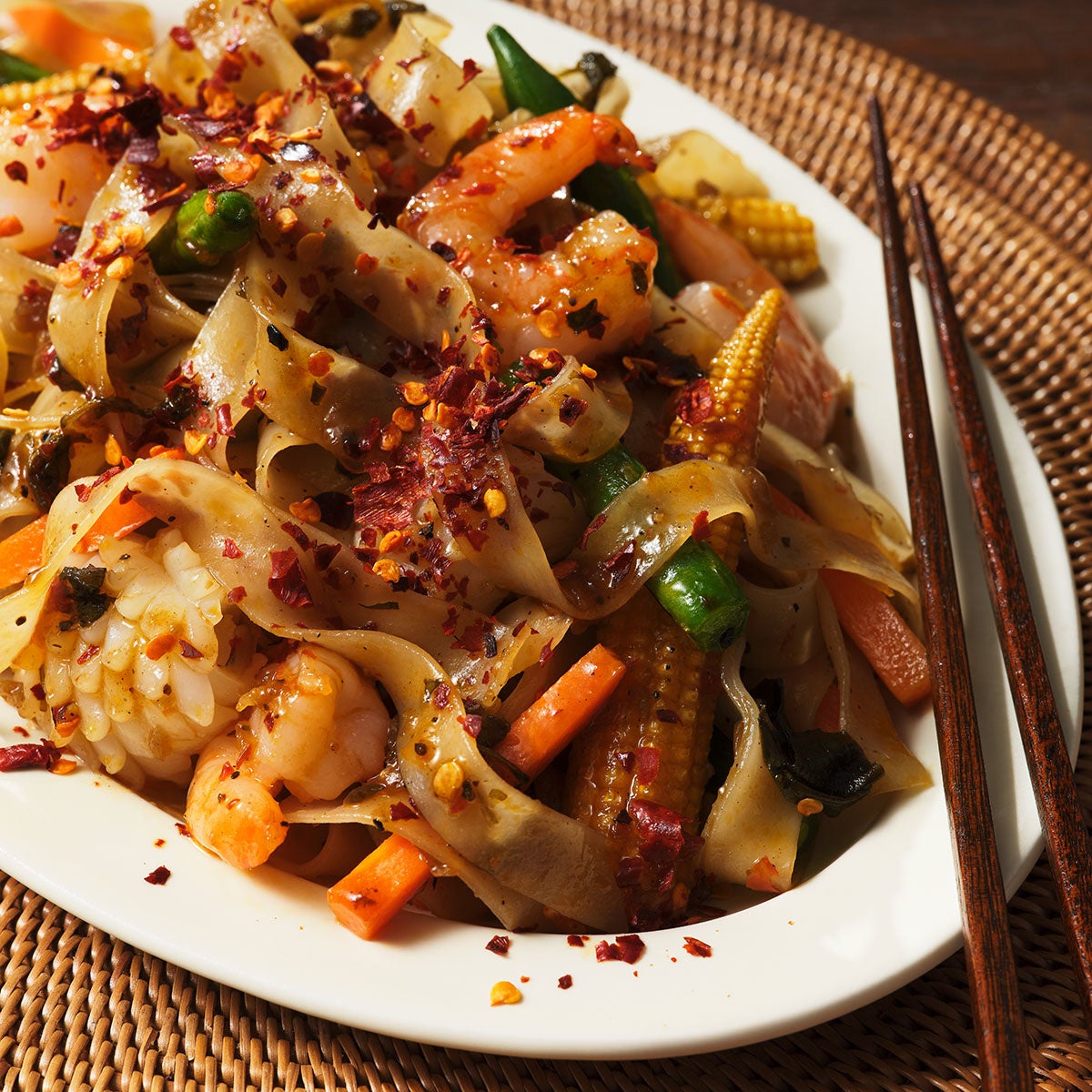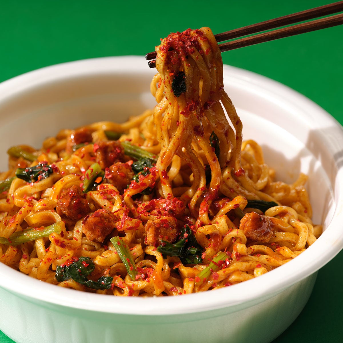 本場タイ屋台の味が手軽に楽しめる、パンチのきいた胡椒と爽やかなバジルの辛さが特徴の激辛タイ焼きそばです。付属のチリパウダーをプラスすればさらに刺激的な辛さに♪