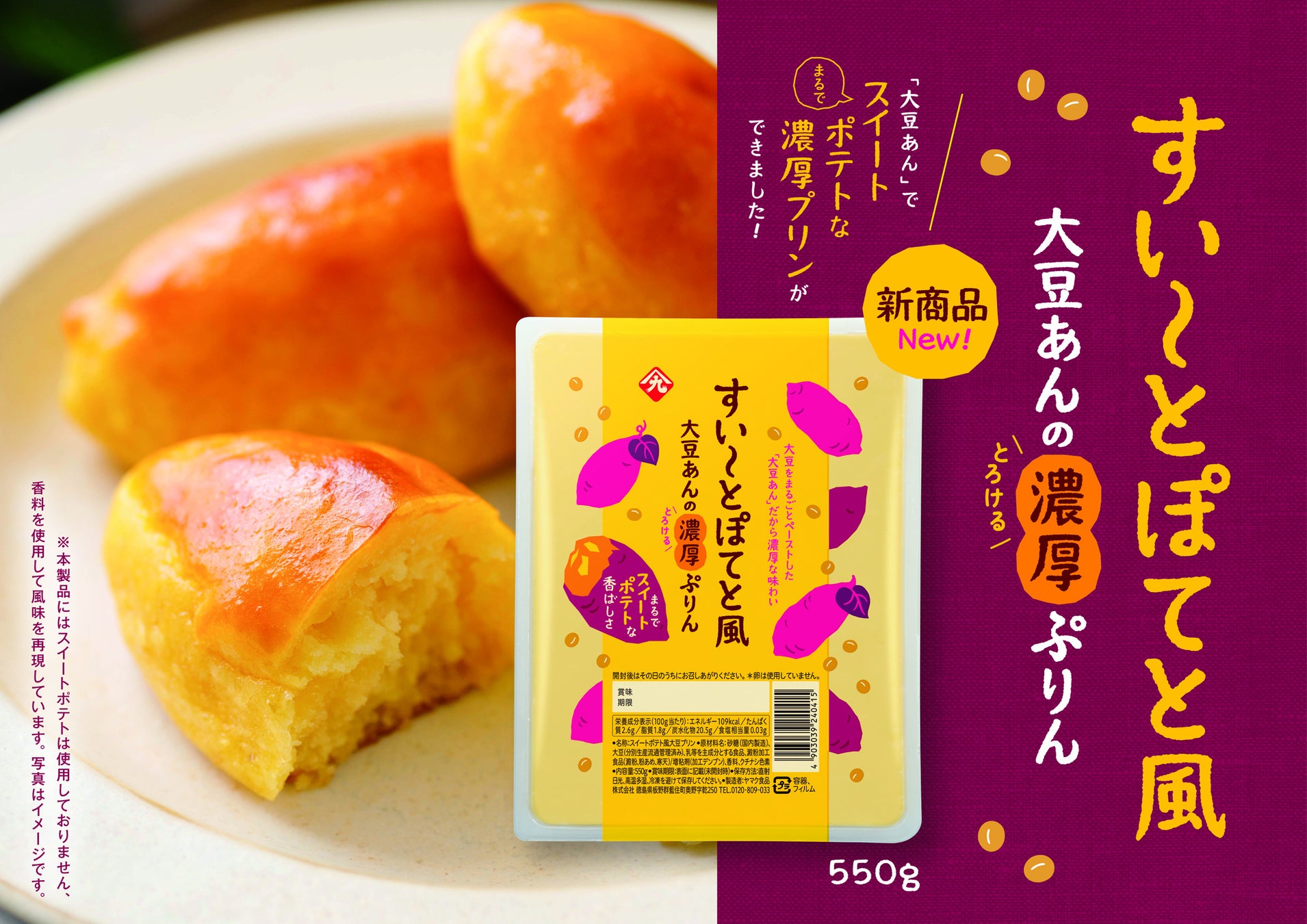 卵不使用!大豆をまるごとペーストした「大豆あん」だから、濃厚な味わいの”大豆あんの濃厚ぷりん”が出来ました。「スイートポテト風大豆プリン」新発売!