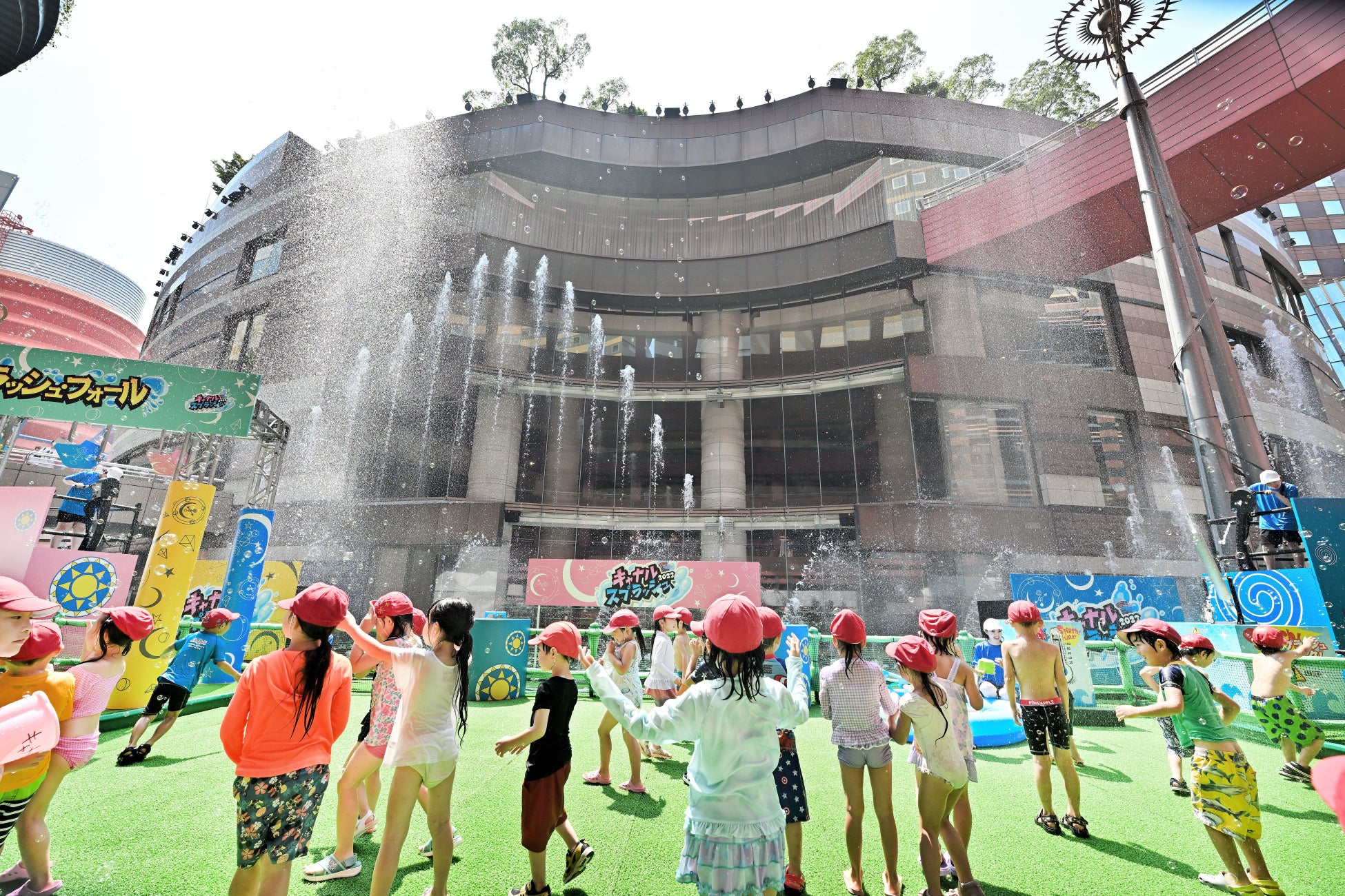 夏季限定の体感型噴水アトラクション「キャナル・スプラッシュ」。通常、イベントなどを行うサンプラザステージがお子様向けの水遊びゾーンに変身します。