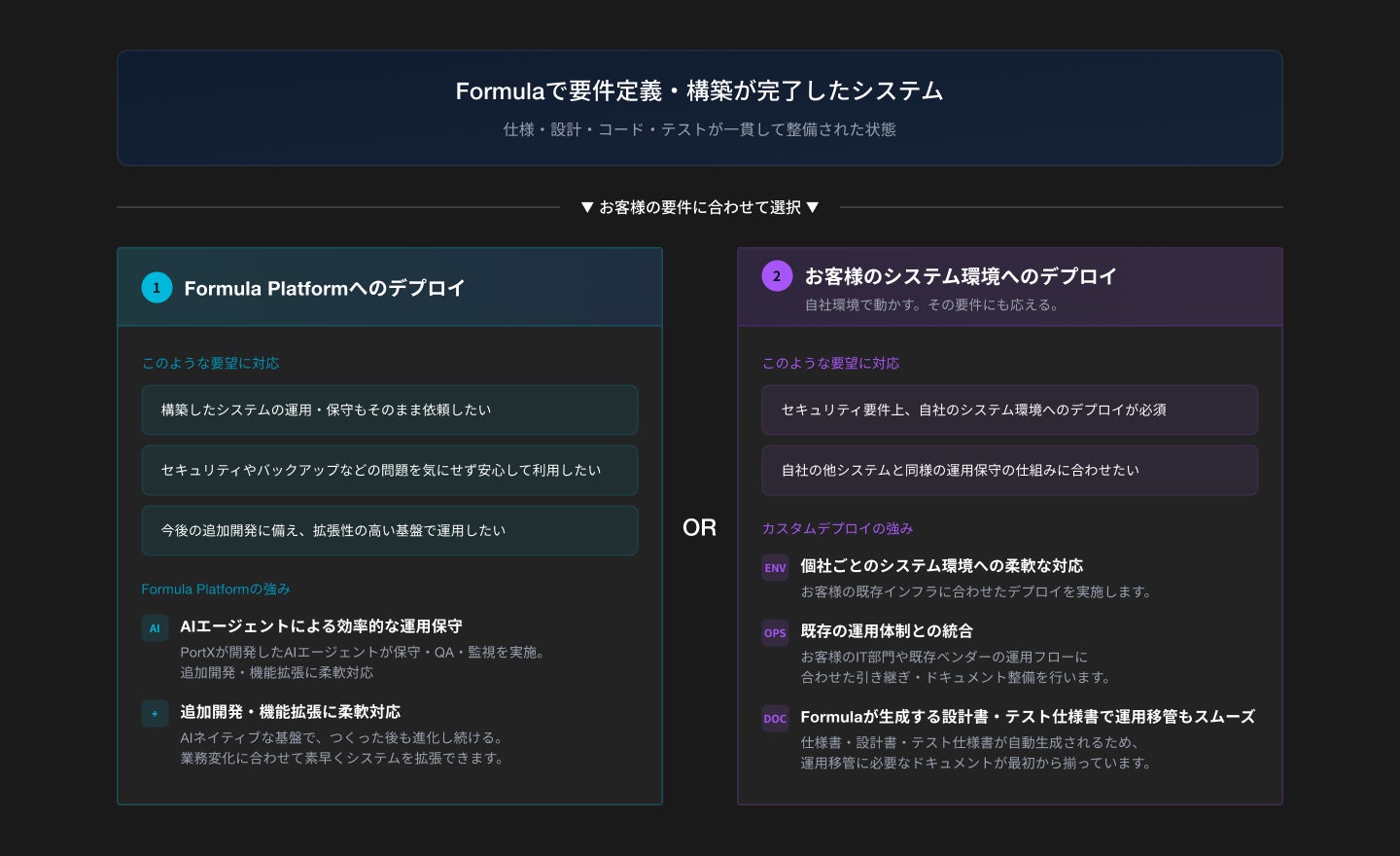 また、運用フェーズにおいても、「唯一の仕様原本(Formula Recipe)」を起点に、仕様・設計・コード・変更履歴を横断してAIが参照・支援することで、問い合わせ対応や改修判断などを含めた保守運用まで支えます。