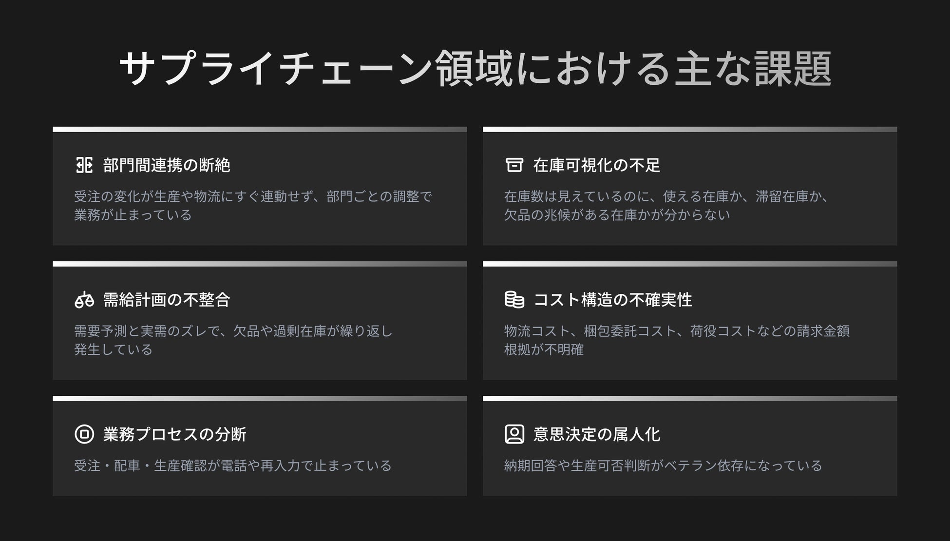 PortXはこれまで、大手製造業のサプライチェーン領域における大規模システム開発にも関与してきました。その中で、売上、利益、納期、サービス品質に直結する中核業務ほど、標準的なSaaSでは対応しきれず、個別開発に頼らざるを得ない一方で、その開発自体が時間・コスト・認識ズレの面で大きな負担となっている現実を強く認識してきました。
