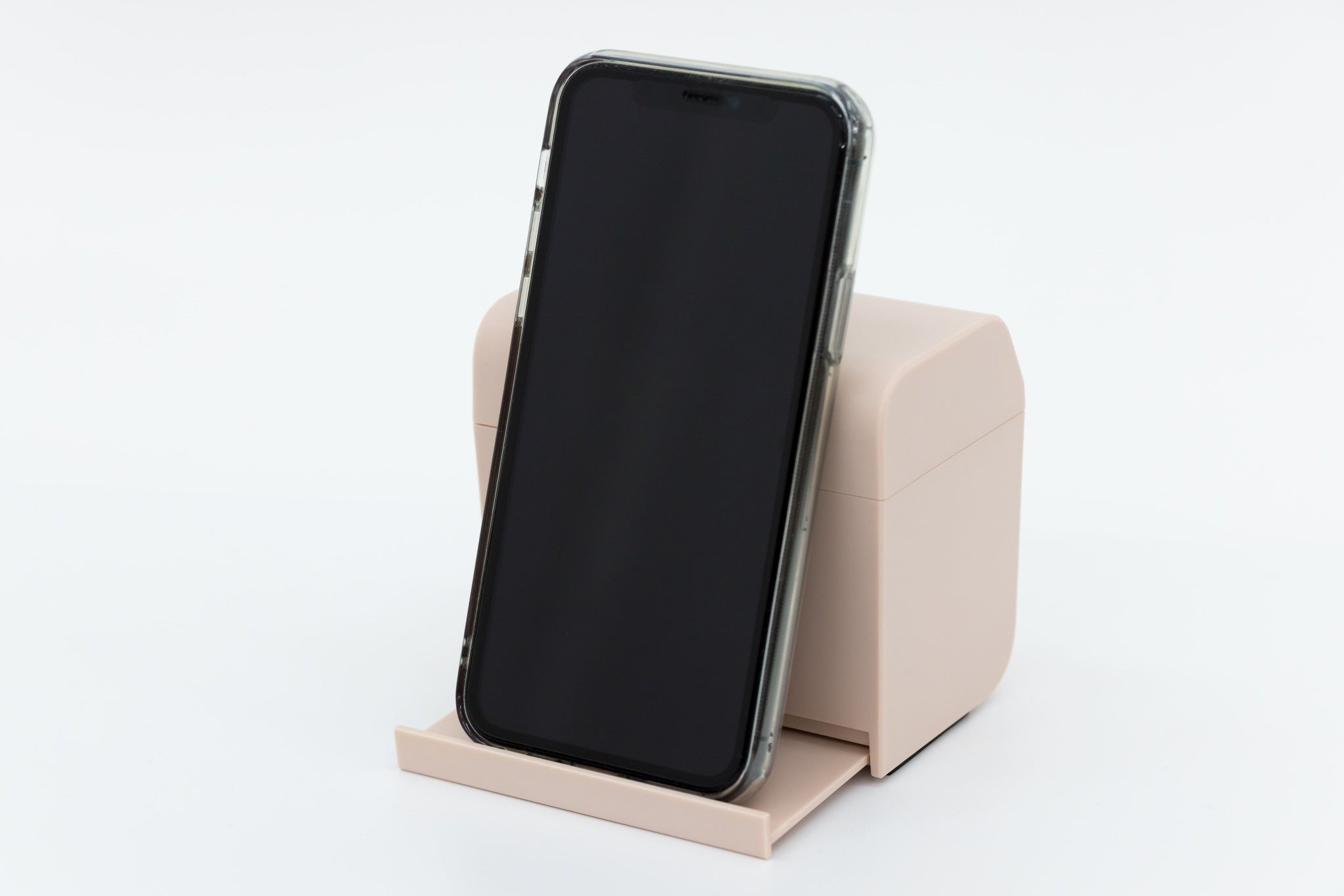 ・付属品などの収納ボックスは、本体の空きスペースにはめ込んで保管可能。スマホスタンドとしても使えます。