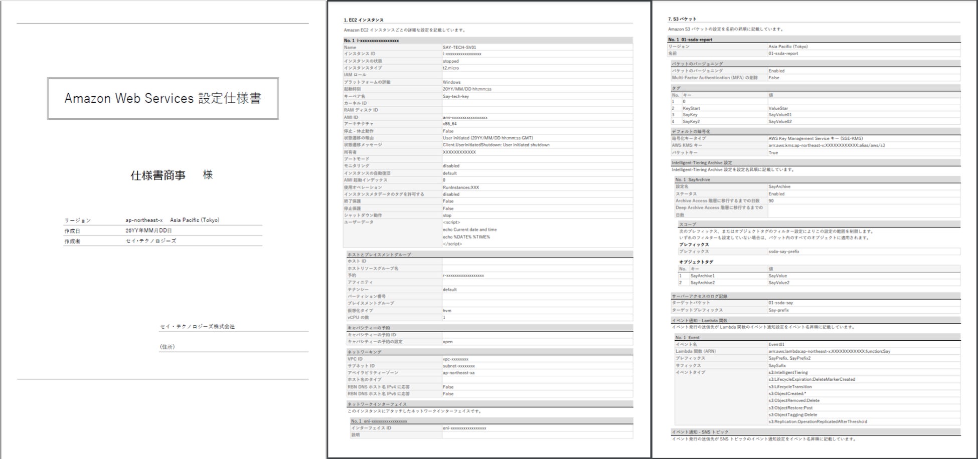 EC2 ではインスタンスごとの詳細な設定情報、S3 ではバケットごとの設定、VPC ではネットワーク情報を取得し、一つの仕様書内に情報を出力できます。今までは Windows や Linux といった OS の情報のみ出力可能でしたが、この度 AWS の情報が出力可能になり、OS 設定の仕様書と同じ統一されたフォーマットで出力することができます。