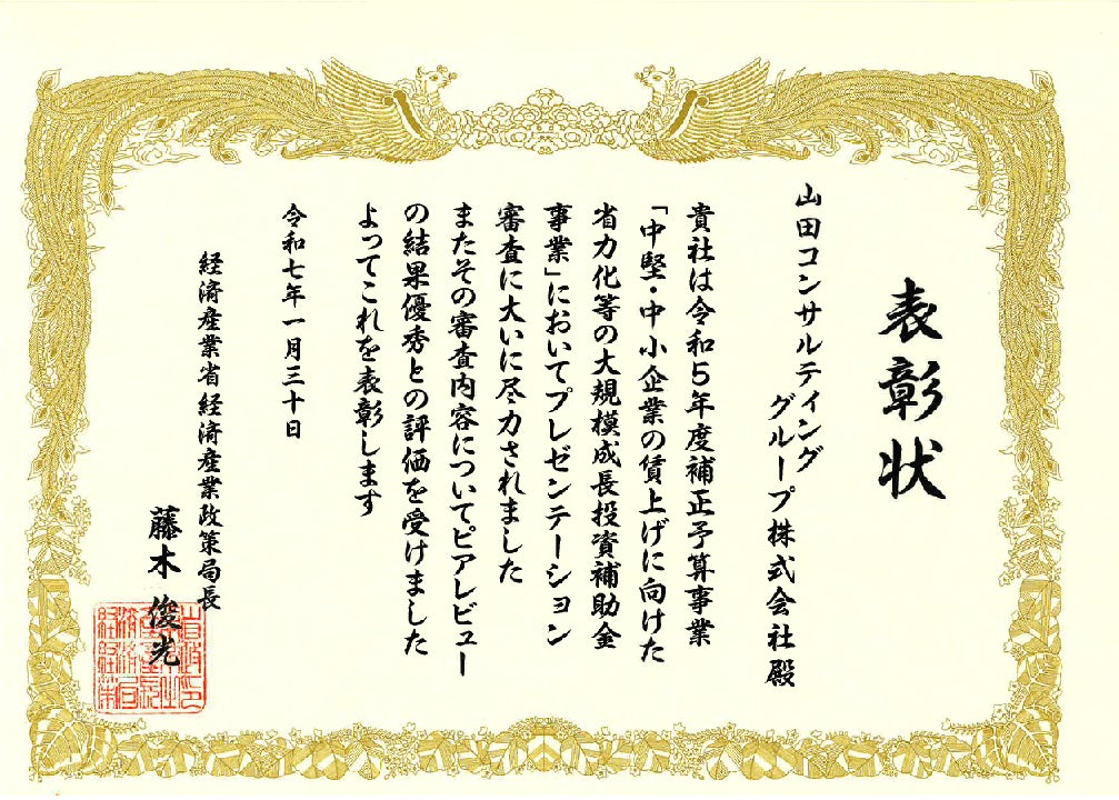 この度、山田コンサルティンググループ株式会社(本社:東京都千代田区、代表取締役社長:増田慶作、プライム市場、以下当社)では、2024年度 経済産業省「中堅・中小企業の賃上げに向けた省力化等の大規模成長投資補助金」の審査員を下記7名の当社コンサルタントが務め、その審査内容に関して、ピアレビューの結果、優秀との評価を受け、表彰を受けました。