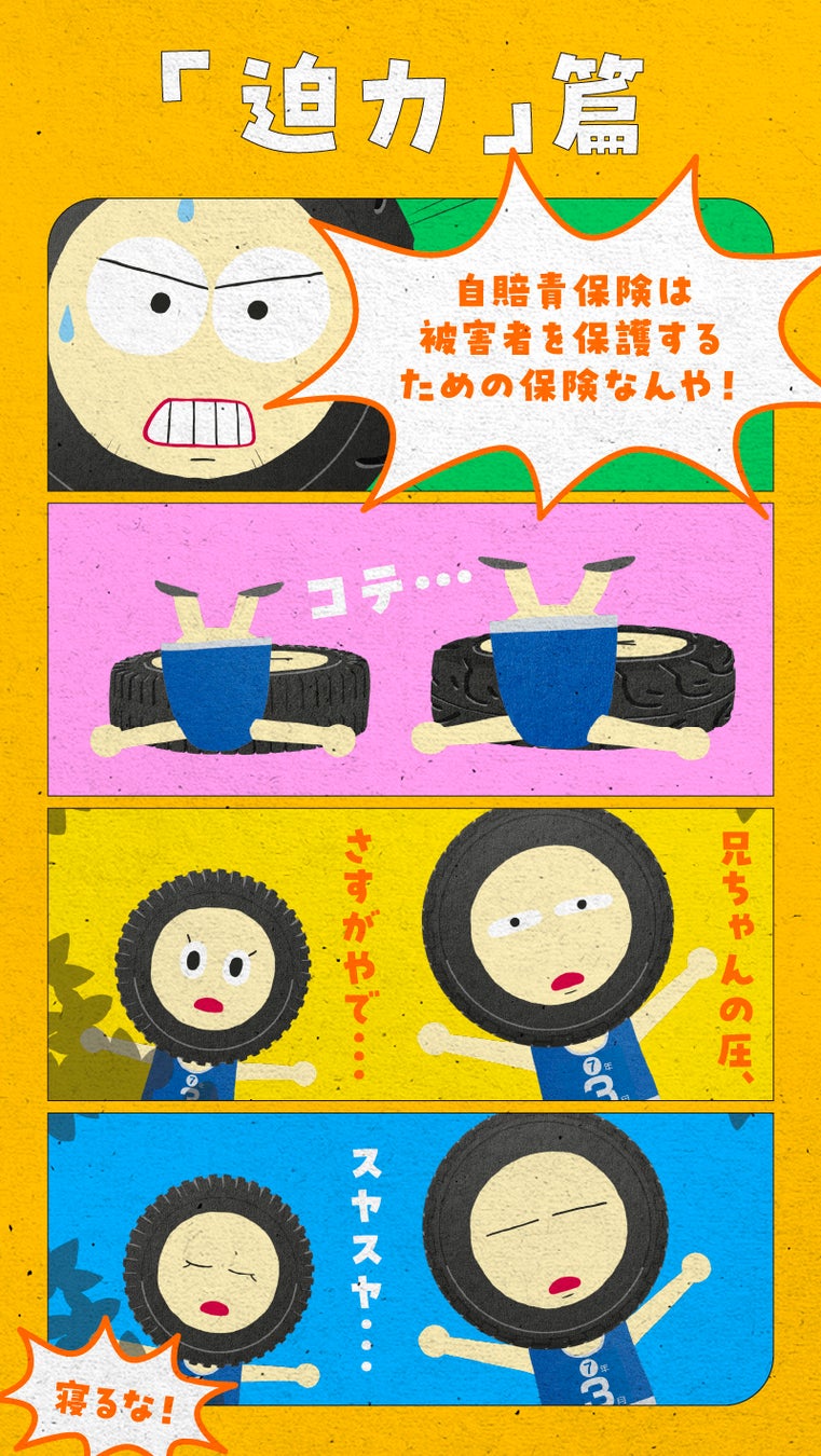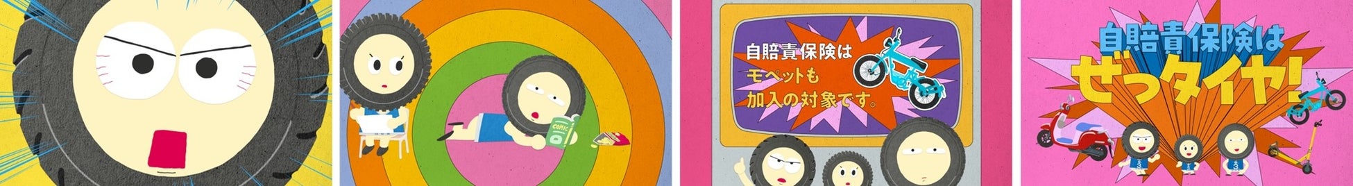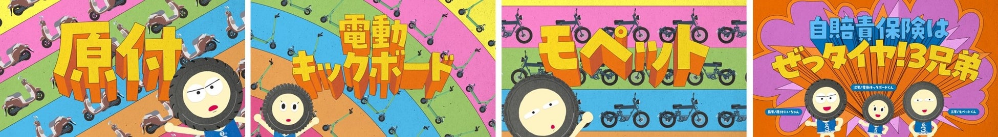 それぞれが原付・電動キックボード・モペットと宣言しながら登場した、ぜっタイヤ!3兄弟。長男・原付にいちゃんが「自賠責保険は、ぜっタイヤ!」と弟たちに熱弁しますが、次男・電動キックボードくん、三男・モペットくんは「そもそも自賠責保険ってなんやねん?」と、いまいち伝わっていない様子。原付にいちゃんは「ジ!ブンのバイ!クにセキ!ニンを持つための保険や! 被害者を保護するためにあるんやで!」と、長男らしく自賠責保険の大切さを説きます。「そりゃぜっタイヤ」と兄の熱意を受け止める弟たちなのでした。
