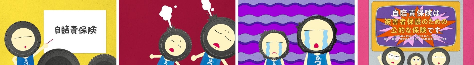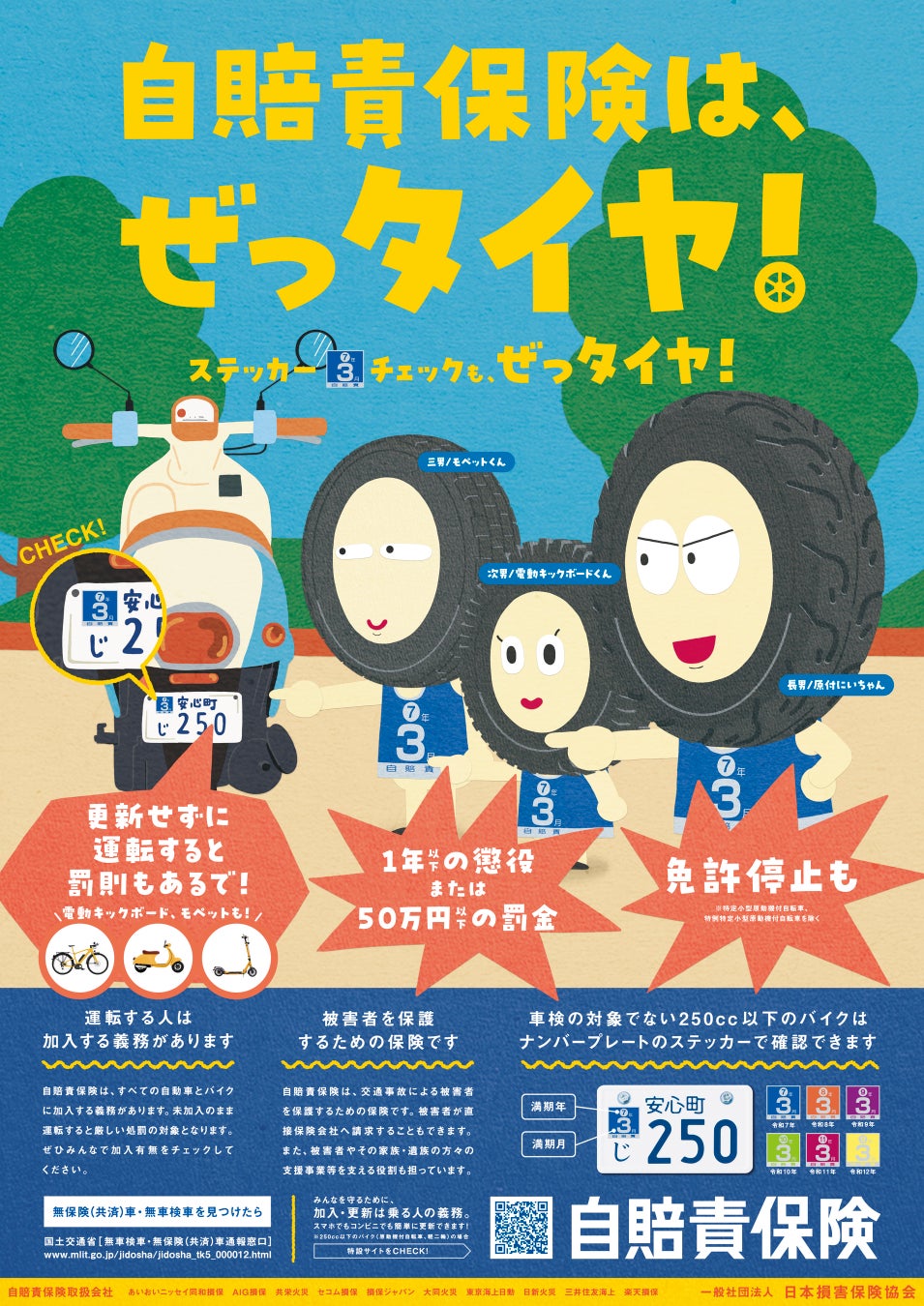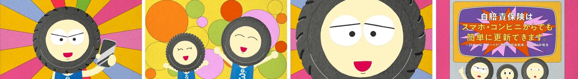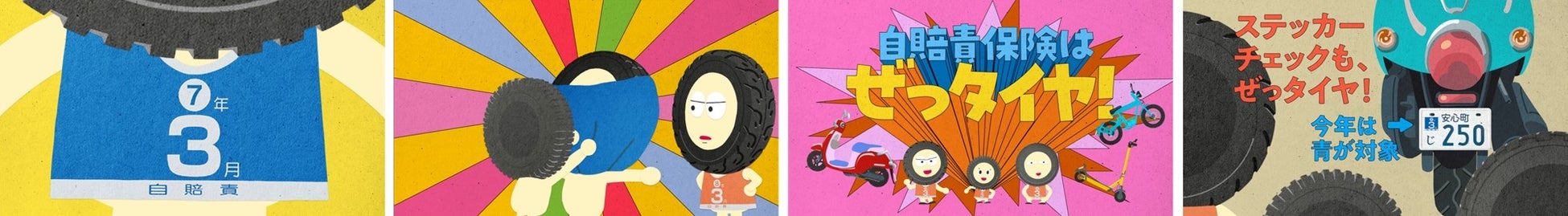 今年の更新対象カラーである青色をモチーフにしたゼッケンを身に纏い新登場した“ぜっタイヤ!3兄弟”が、①被害者を保護するために、公道を走るすべての車が絶対に加入しなければならないこと②未加入のまま運転すると厳しい処罰の対象となること③車やバイクだけではなく、電動キックボードやモペットも加入の対象であること④更新はスマホ・コンビニで簡単にできることなどを、個性あふれるやりとりを通じて伝えていきます。