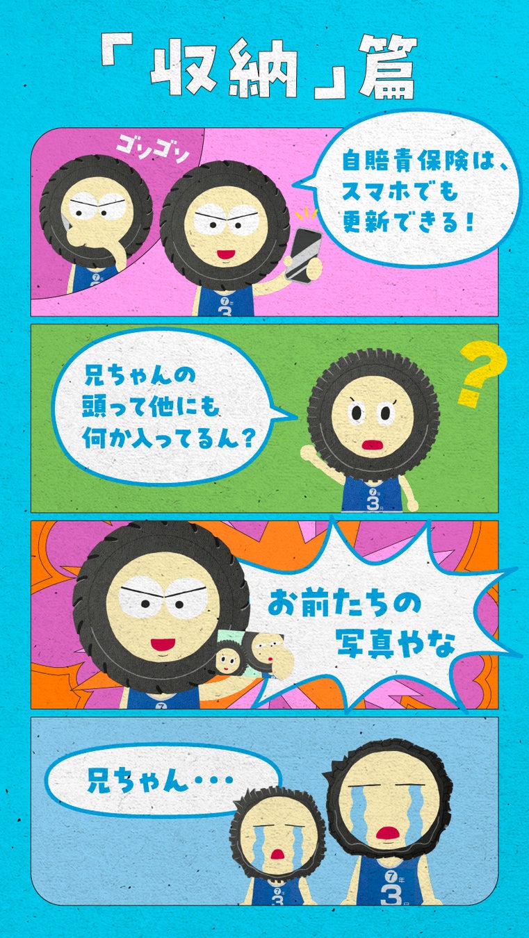 長男・原付にいちゃんが「自賠責保険は、ぜっタイヤ!」と弟たちに熱弁、「でもなぁ、めんどいねん」とぼやく次男・電動キックボードくんと三男・モペットくん。原付にいちゃんが「スマホからできてもか? なんとコンビニからもできる」と伝えると、電動キックボードくんとモペットくんは「やったー!」と大喜び。そんな兄弟を見て「はねるねぇ」とつぶやく、原付にいちゃんなのでした。