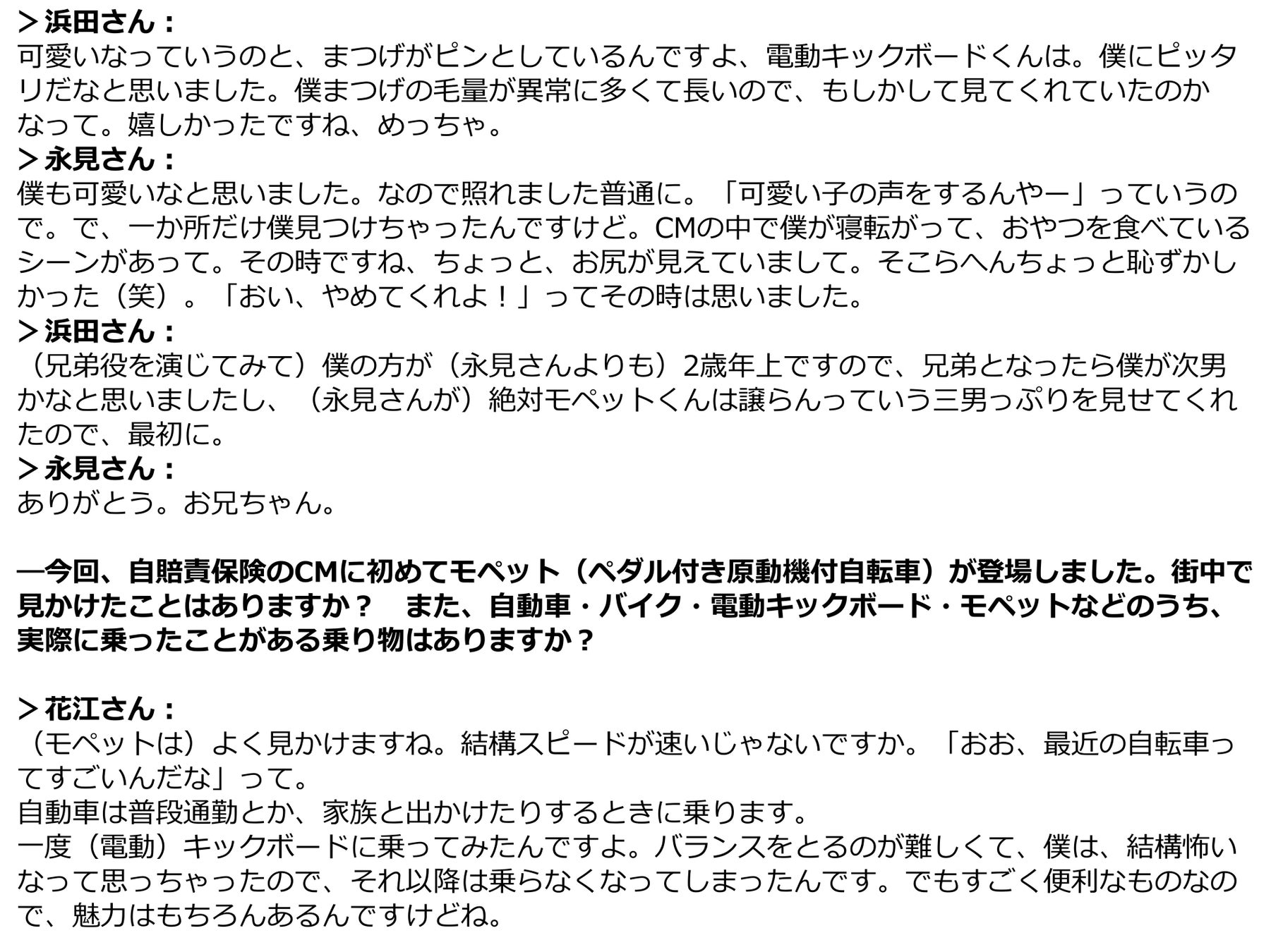 長男・原付にいちゃんが「自賠責保険は、ぜっタイヤ!」と弟たちに熱弁、「車とバイクだけの話とちゃうねんな」と、メモを取りながら聞く次男・電動キックボードくん。話をまったく聞かずにくつろいでいる三男・モペットくんに、原付にいちゃんが「モペット!お前もやで!」と指摘します。モペットくんは戸惑いつつも、「そうなんや~、覚えとかな!」と、自身も加入対象であることを学んだのでした。