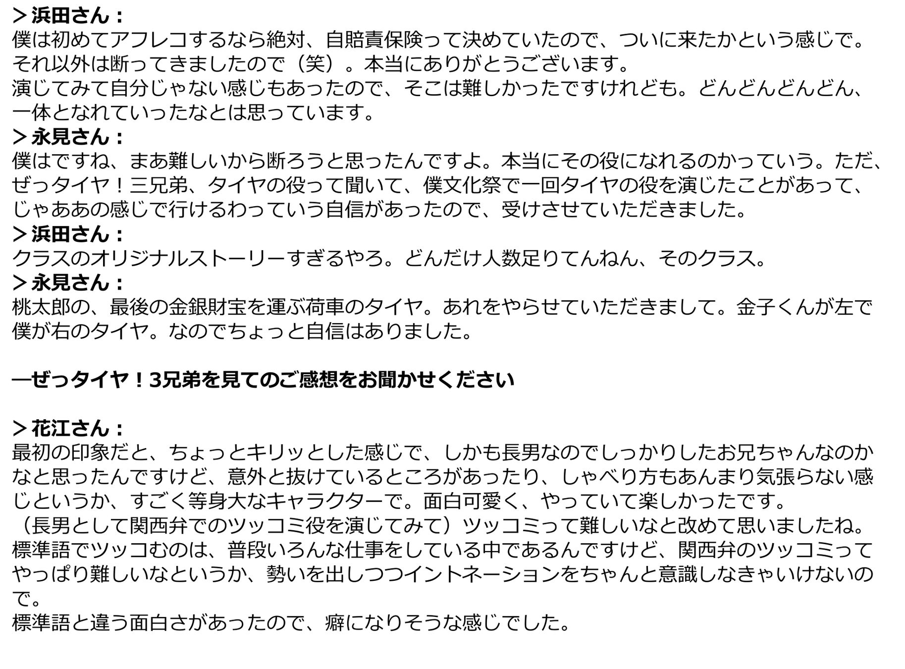 自賠責保険の大切さをコミカルに熱く伝えるアニメが完成! 声優初挑戦となるカベポスターのお二人へ、長男役・花江さんから優しいアドバイス! “ぜっタイヤ!3兄弟”のLINEスタンプ、4コマ漫画も展開