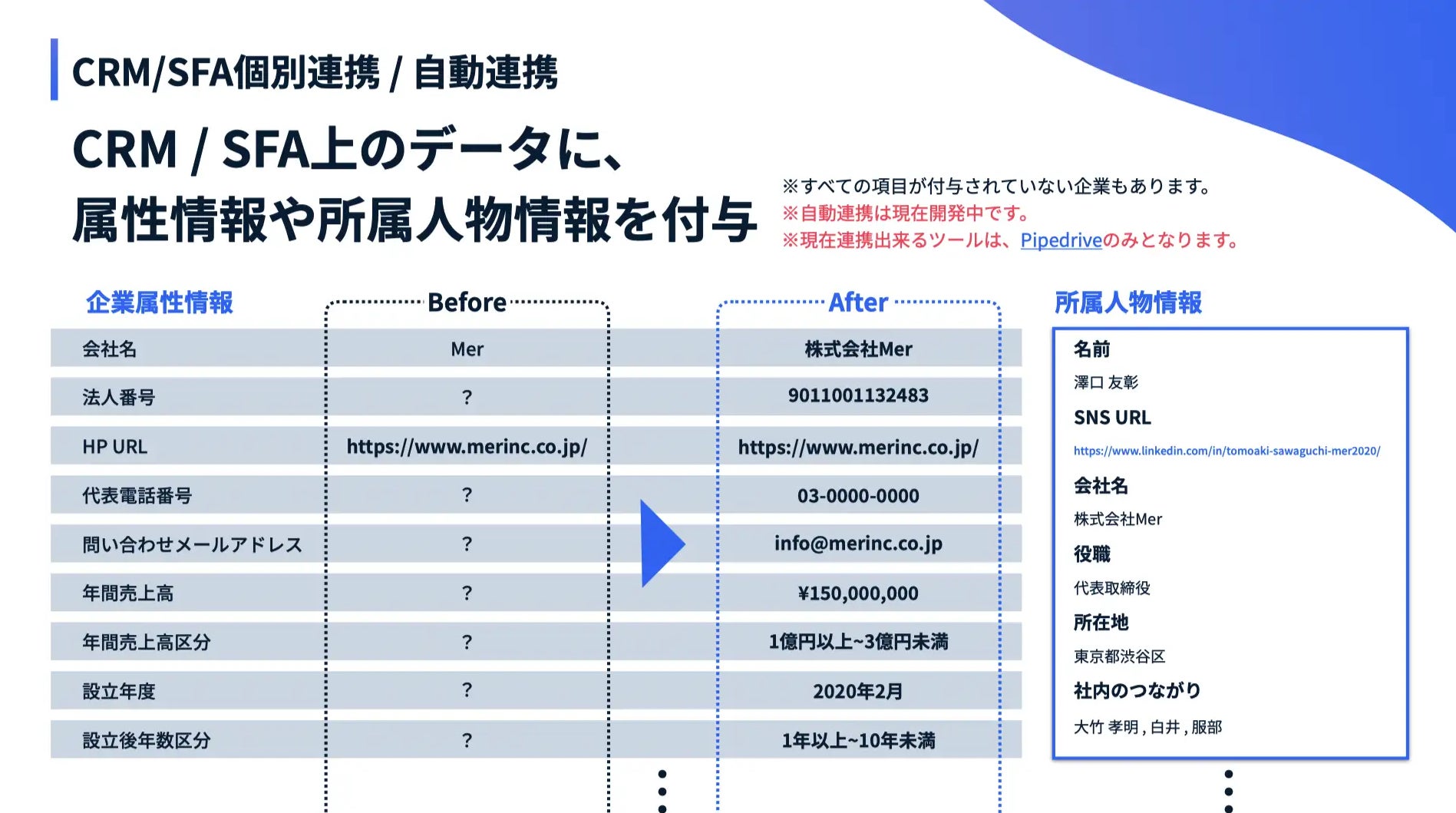 進行中の取引情報に自動的に企業の属性情報の付与をすることで営業マンの調査・入力工数を大幅に削減。