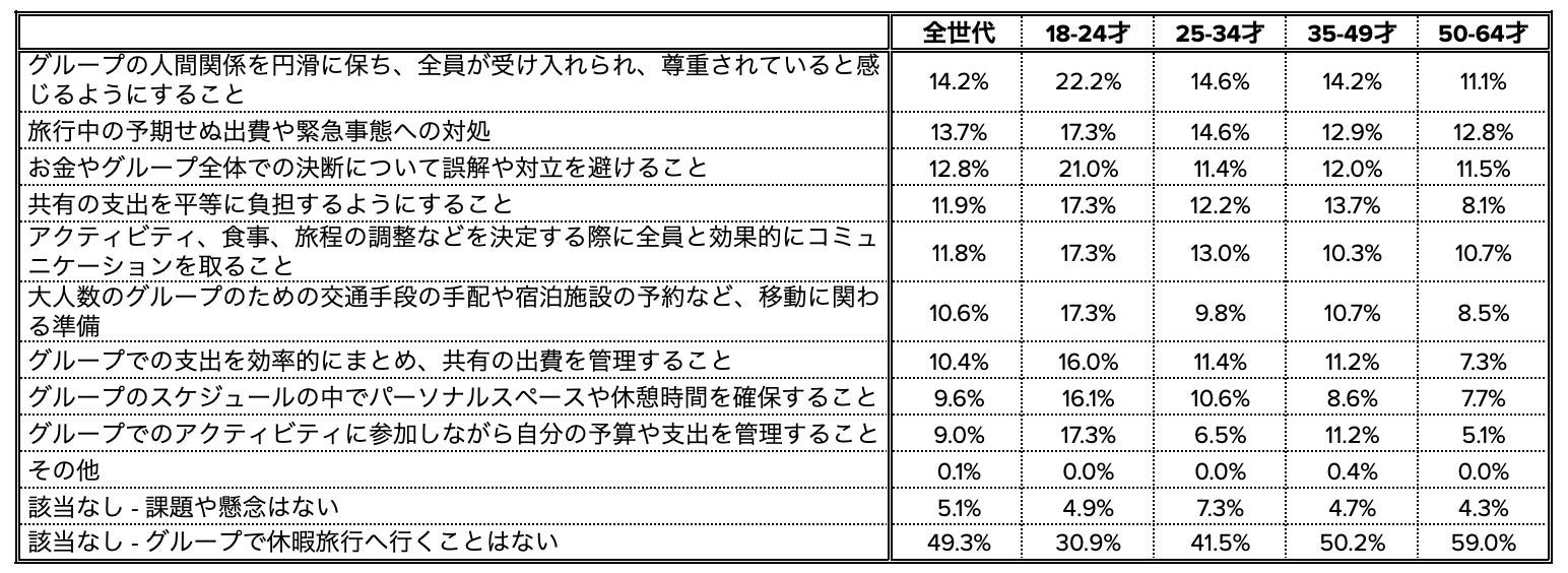 その中でも18-24世代は他の世代に比べて懸念や課題を感じており、多くの項目で最も割合が多い結果になり、年齢が上がるほど数値が下がる傾向にあります。「グループの人間関係を円滑に保ち、全員が受け入れられ、尊重されていると感じるようにすること」が22.2%、「お金やグループ全体での決断について誤解や対立を避けること」が21.0%、「共有の支出を平等に負担するようにすること」が17.3%、「グループでのアクティビティに参加しながら自分の予算や支出を管理すること」が17.3%と比較的高く、”割り勘”や”立て替え”などによるお金にまつわる遠慮や人間関係トラブルを気にする傾向が見られました。