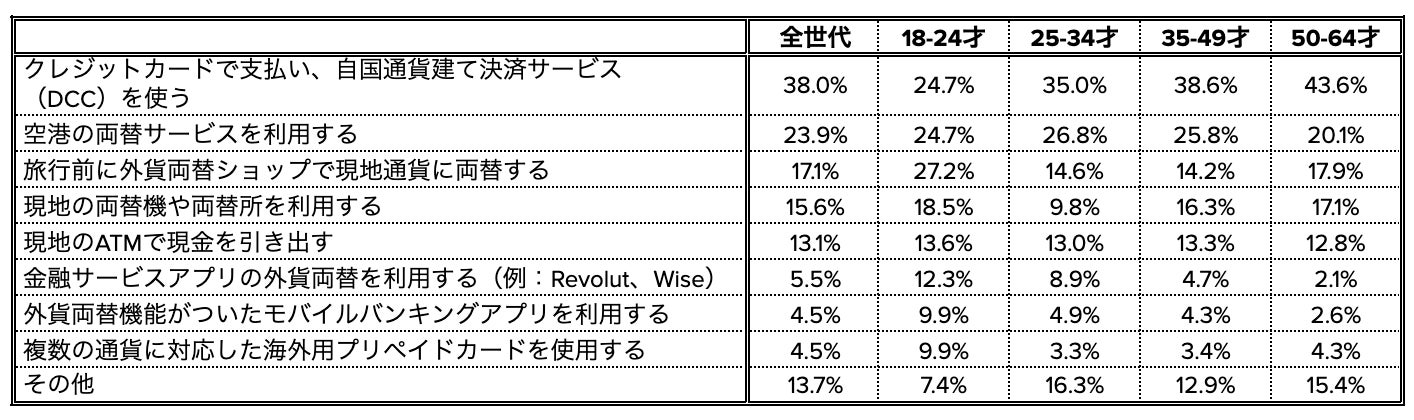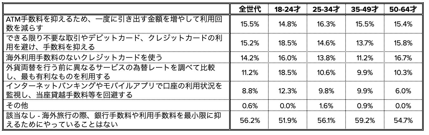 また、世代別での傾向を見ると、18-24世代は、「海外利用手数料のないクレジットカードを使う」「できる限り不要な取引やデビットカード、クレジットカードの利用を避け、手数料を抑える」など手数料を最小限に抑えるために複数の対策を満遍なくとっていることがわかりました。