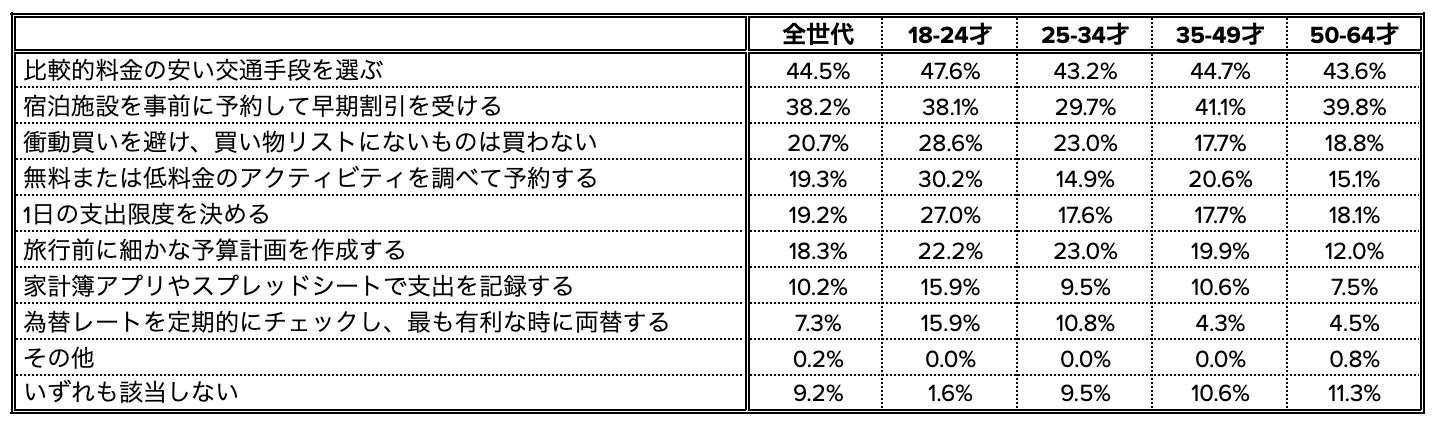 一方で、「無料または低料金のアクティビティを調べて予約する(30.2%)」、「衝動買いを避け、買い物リストにないものは買わない(28.6%)」、「家計簿アプリやスプレッドシートで支出を記録する(15.9%)」などは18-24世代が各世代最多であり、特に「1日の支出限度を決める(18-24世代:27.0%、50-64世代:18.1%)」や、「為替レートを定期的にチェックし、最も有利な時に両替する(18-24世代:15.9%、50-64世代:4.5%)」は、10ポイント前後の差がありました。