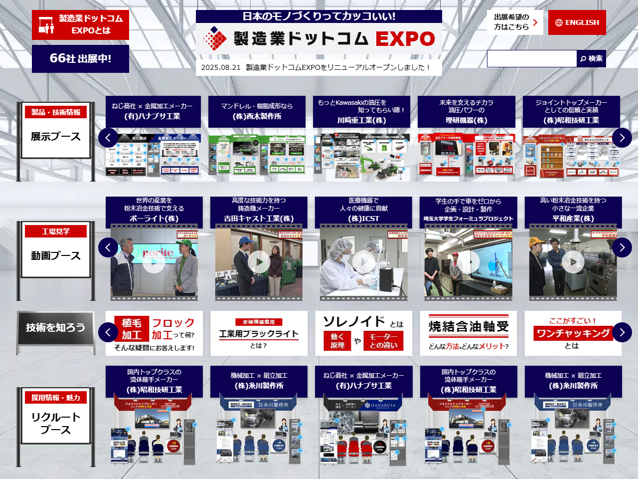 製造業ドットコムEXPOは、「日本のモノづくりってカッコいい!」をテーマに、製造業企業が一堂に会し、Web上で閲覧できる製造業特化型のバーチャル展示会です。