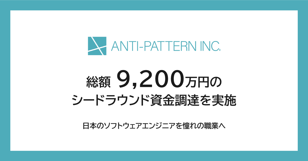 「日本のソフトウェアエンジニアを憧れの職業へ」を理念に掲げる株式会社アンチパターン(本社:東京都港区、代表取締役 小笹 佑京、以下当社)は、エンジェル投資家等から総額9,200万円の資金調達を実施したことを発表いたします。