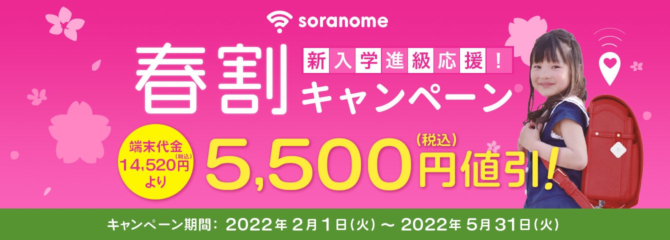 株式会社グローバルコネクション(本社:埼玉県和光市、代表取締役社長:朴永虎)は、子供見守りGPSサービスsoranomeに新規お申込みいただくと、端末代金14,520円(税込)より5,500円(税込)が割引となる「新入学・進級応援!春割キャンペーン」を2022年2月1日(火)から5月31日(火)まで実施いたします。