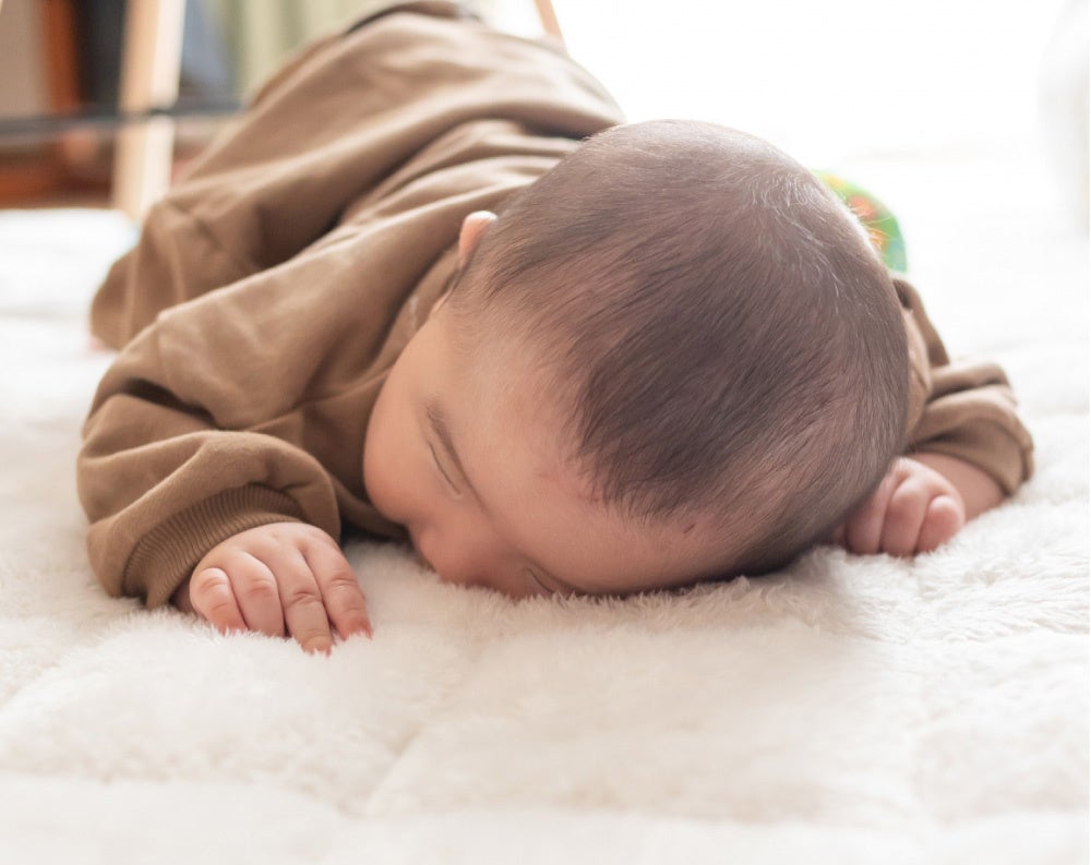 うつ伏せができるようになる時は突然やってきます。嬉しい成長ですが、少し心配。