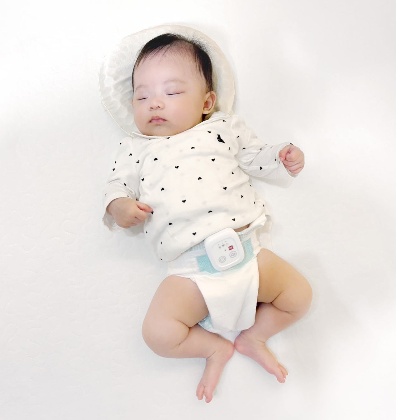 体動の検知だけでは寝返りが始まってからのうつ伏せが判断できないため、うつ伏せ検知のためにセンサーを追加しました。充電タイプとしたことで、コンパクトに改善、内蔵バッテリーで誤飲の心配がなくなりました。乾電池や特殊な電池の準備やストックも不要です。また簡単に取り付けられるようにおむつに取り付けとしました。