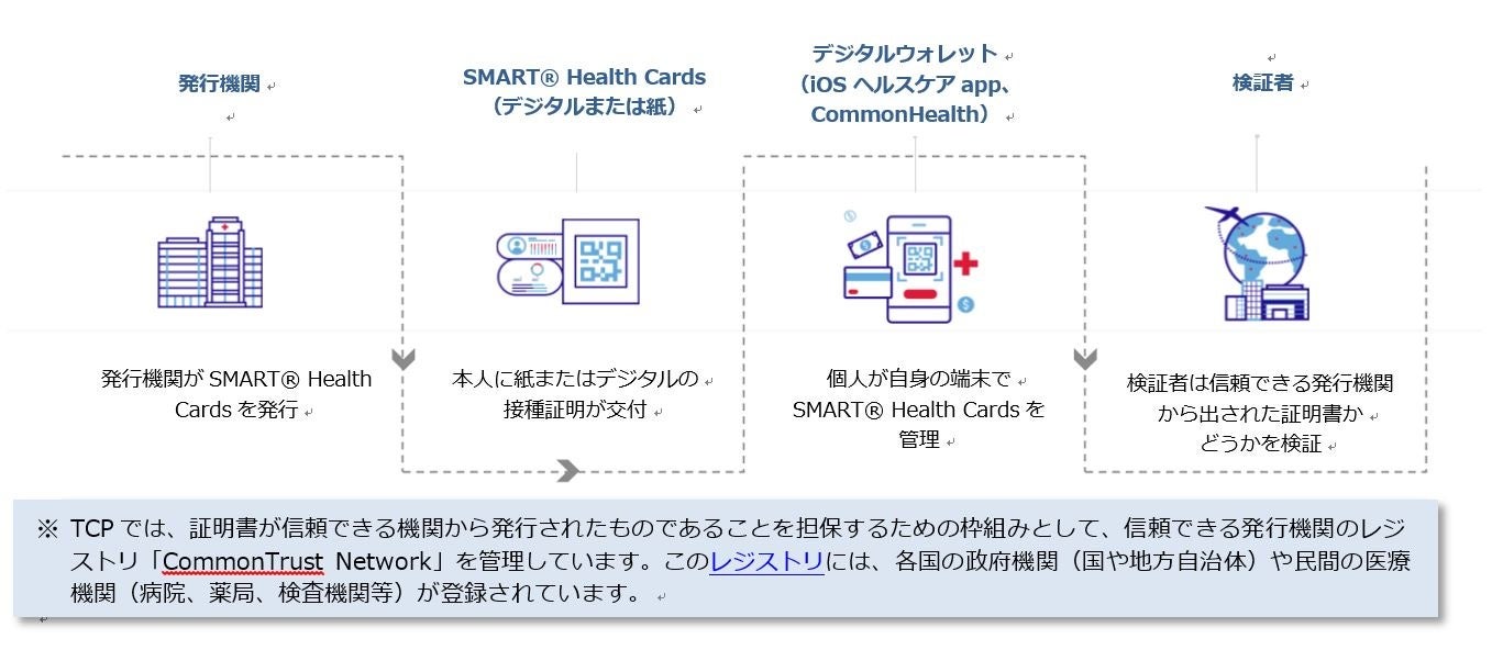 SMART® Health Cardsはワクチン接種履歴や検査結果などの健康情報をデジタル記録するための国際規格で、TCPのほかApple、Microsoft、全米病院ランキング1位のメイヨークリニックなどテクノロジーと医療の分野をリードする組織がステアリングを務める官民連合「Vaccination Credential Initiative」が中心となって推進しています。