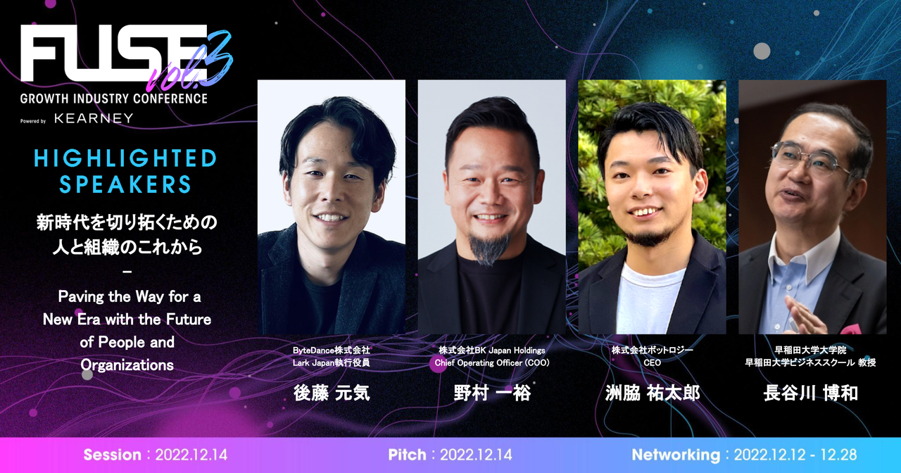 Lark Japanは、本年12月14日(水)にフォースタートアップス株式会社とCIC Japan合同会社が共同で開催する、成長産業カンファレンス『FUSE (https://fuse.forstartups.com)』Vol.3 にゴールドスポンサー(https://fuse.forstartups.com/#sponsors)として参加し、「新時代を切り拓くための人と組織のこれから」というテーマのセッションに登壇します。