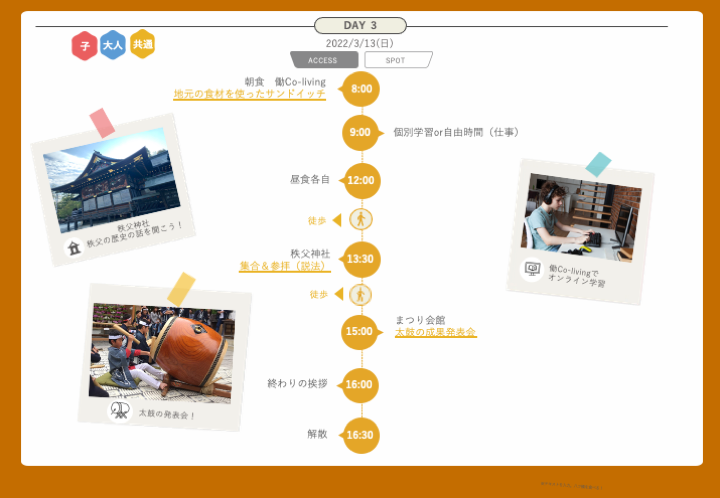 子供たちが実際に地域を旅することで、その地域の伝統技能や地域文化、初めて出会う人との交流を通じて社会的スキルを身に着け、学校や教科書だけでは知ることができない、日本に眠る数々の伝統文化をリアルに学ぶことができます。一方で、親はリモートワーク、子はオンラインで学科授業を受けられる環境も完備。