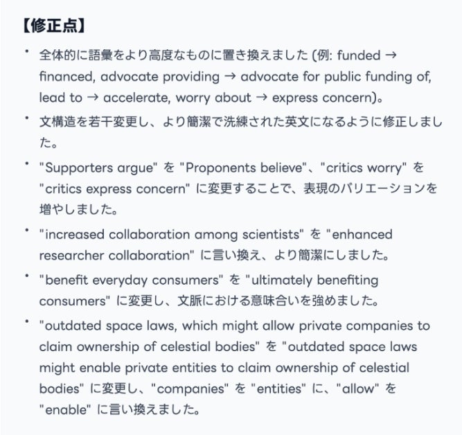 • 改修内容: 添削例を提示し、どの単語・文構造を修正したかを【修正点】として細かく解説。 これにより「この部分は因果関係を明示する接続詞を使うべき」「ここは名詞形に変えるとコンパクトに要点がまとまる」など、具体的な改善アドバイスが得られるようになりました。